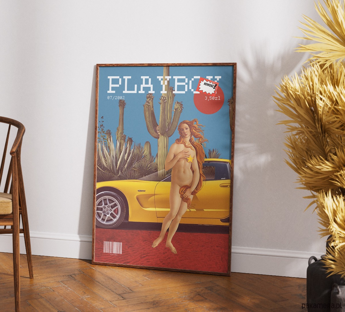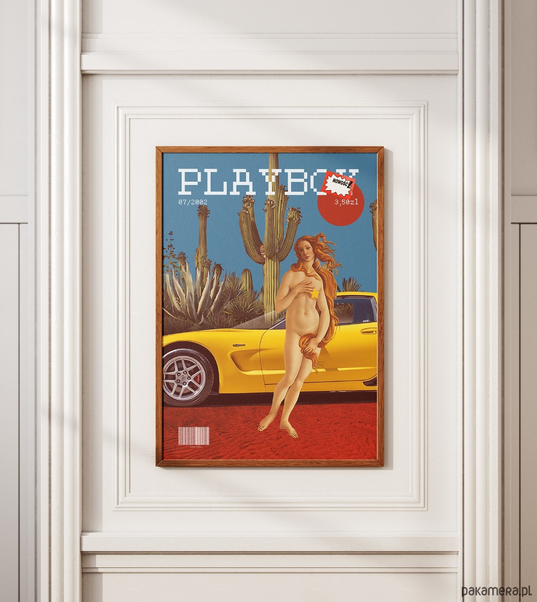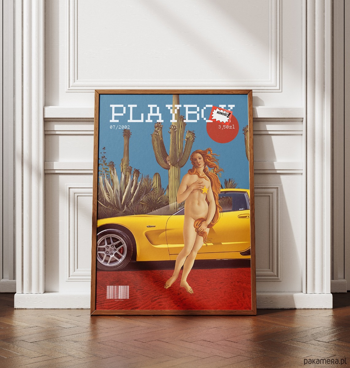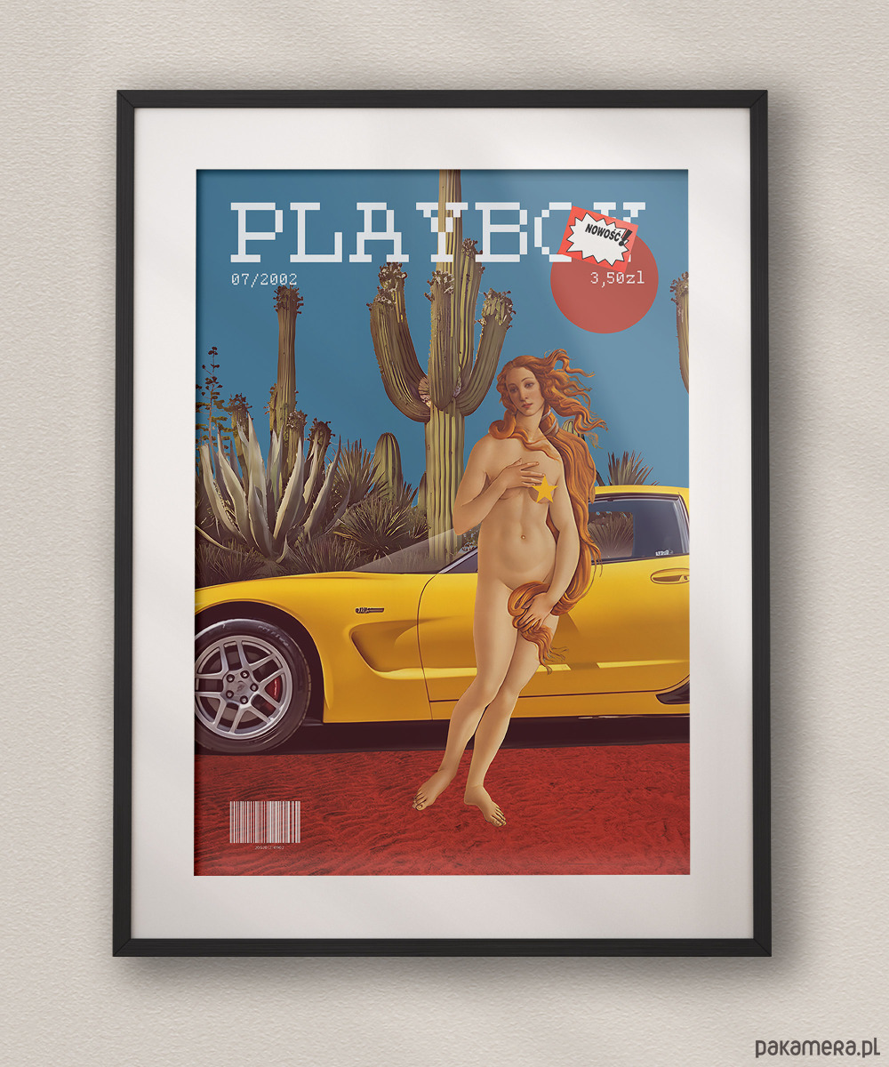 Bezczelna, pop-artowa prowokacja, która redefiniuje kanony piękna i luksusu. Plakat bawi się anachronizmem, przenosząc renesansową Wenus z obrazu Botticellego w sam środek pustynnego krajobrazu, tuż obok żółtej Corvette Z06. Stylistyka retro-okładki magazynu w pixelowym wydaniu, uzupełniona ironicznymi detalami jak metka "NOWOŚĆ!" czy cena w złotówkach, tworzy unikalny pomost między sztuką wysoką a nostalgią za latami 2000.