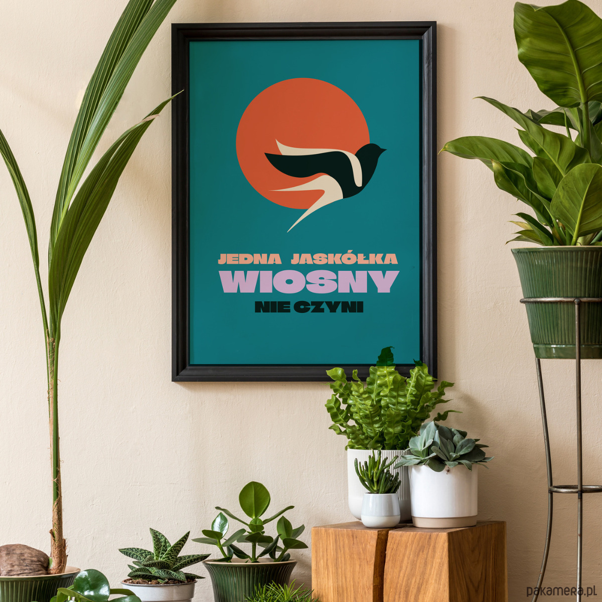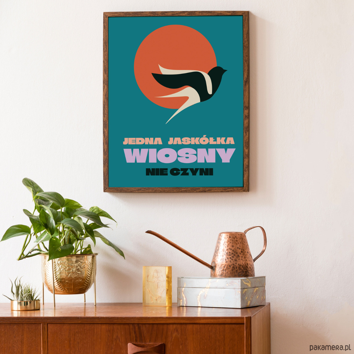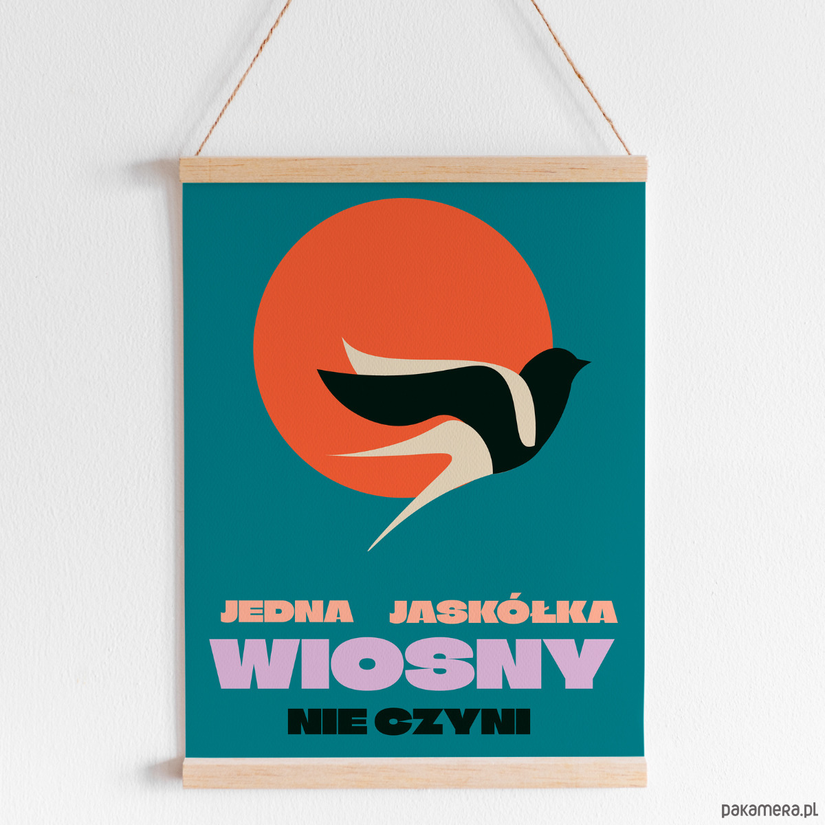 Kiedy kolorów w domu brakuje, plakat z jaskółką na ścianie ląduje. Wielobarwny, pozytywny, w stylu z PRL-u, zachwyci wielu. Pozwól tej zwiastującej wiosnę ptaszynie przysiąść nad kuchennym stołem, nad biurkiem, łóżkiem czy rozpromienić wnętrze salonu, sieni a nawet pokoju gościnnego. Wydrukowany na wysokiej jakości papierze poster sprawdzi się, jako podarek dla zakochanej w naturze studentki biologii, babci mieszkającej gdzieś na spokojnej wsi, czy dla konesera artystycznych plakatów, by mógł dołożyć kolejny skarb do swej galerii. Nie ma co szukać wielkiej okazji, plakat na ścianę “Jaskółka” może uczynić każdy zwyczajny dzień bardziej kolorowym i optymistycznym. A jak zaproszą do cioci na imieniny, babci na urodziny czy do dziadka na rocznicę, z pustą ręką nie wypada, więc tu plakat ten się nada.