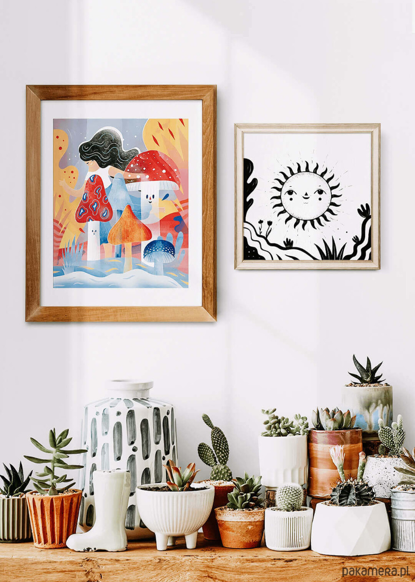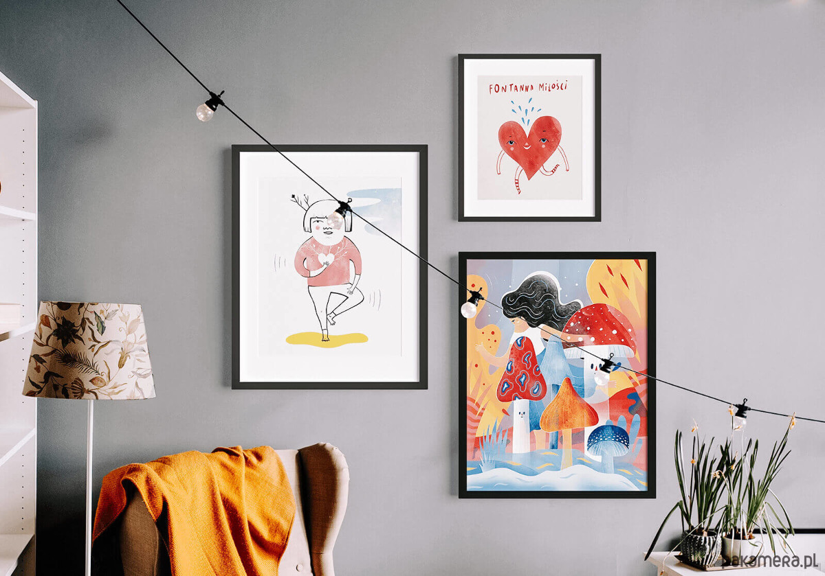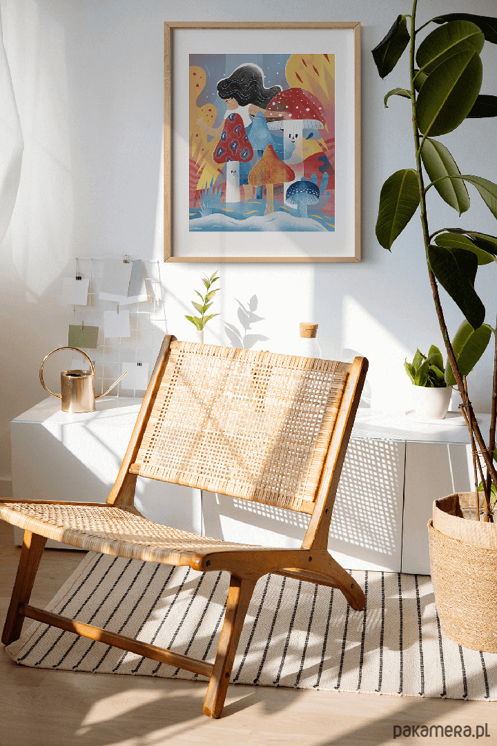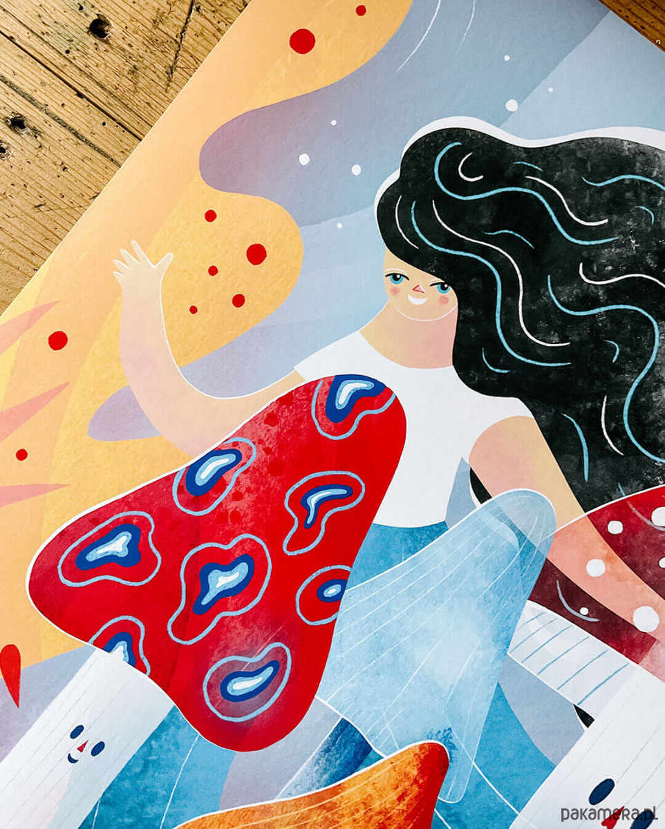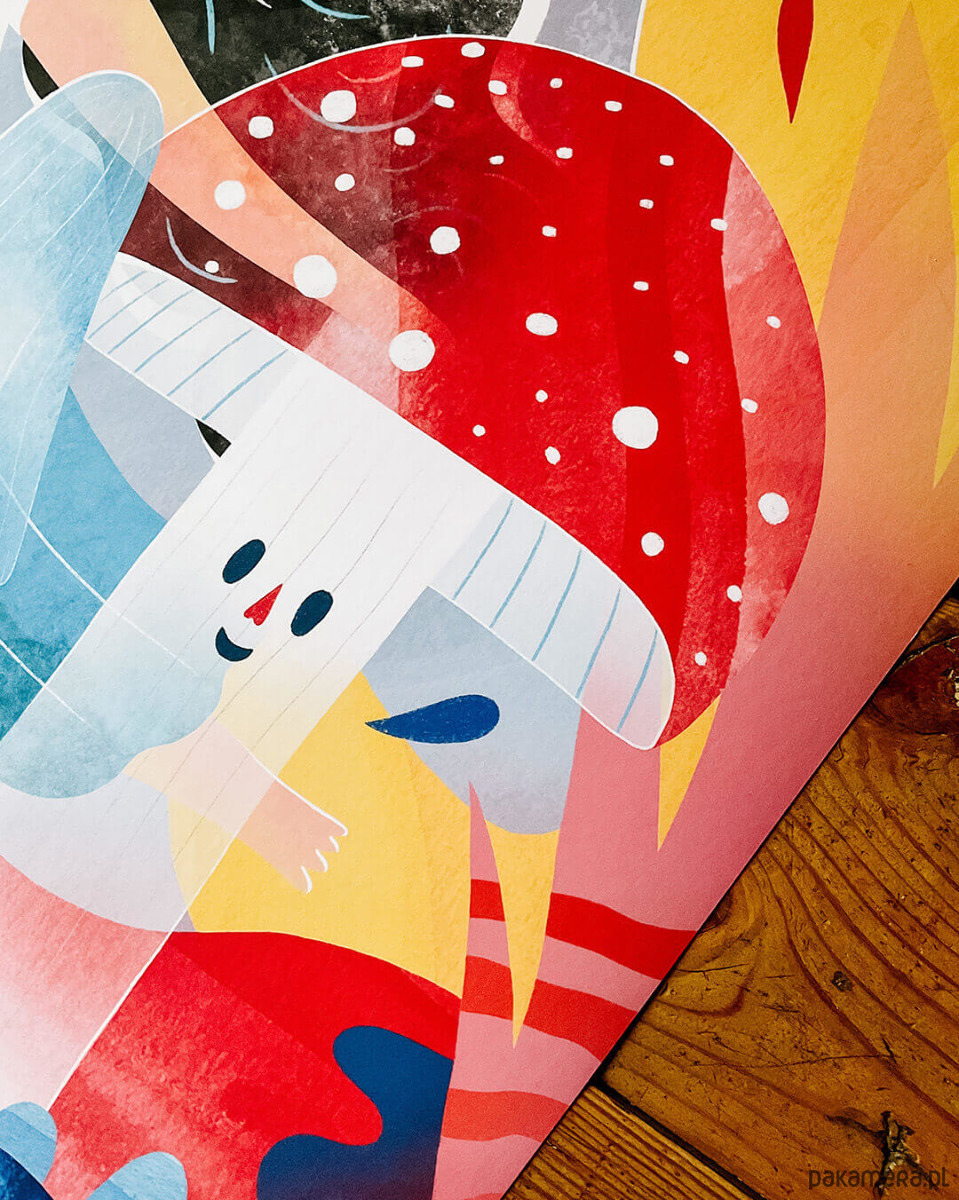 A to plakat dla zapalonych grzybiarzy i poszukiwaczy przygód. Wytrwałych tropicieli rydzów, kań i opieniek. Dla tych, których rozczula widok nakrapianych kapeluszy muchomorów, a na łące czują się jak u siebie. Dla małych i dużych – do salonu i do sypialni – wszędzie tam, gdzie potrzeba intensywnego koloru i kosmicznej energii.