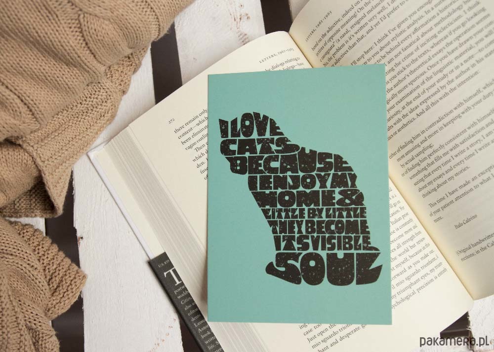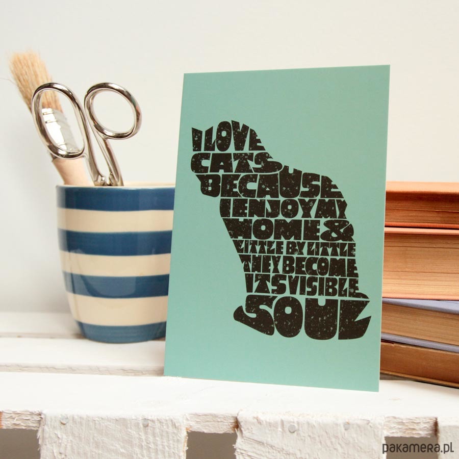 Typograficzna kartka pocztowa z cytatem z Jeana Cocteau układającym się w kształt kota: "I love cats because i enjoy my home; and little by little, they become its visible soul".