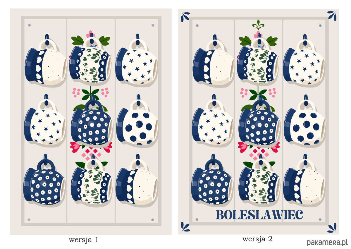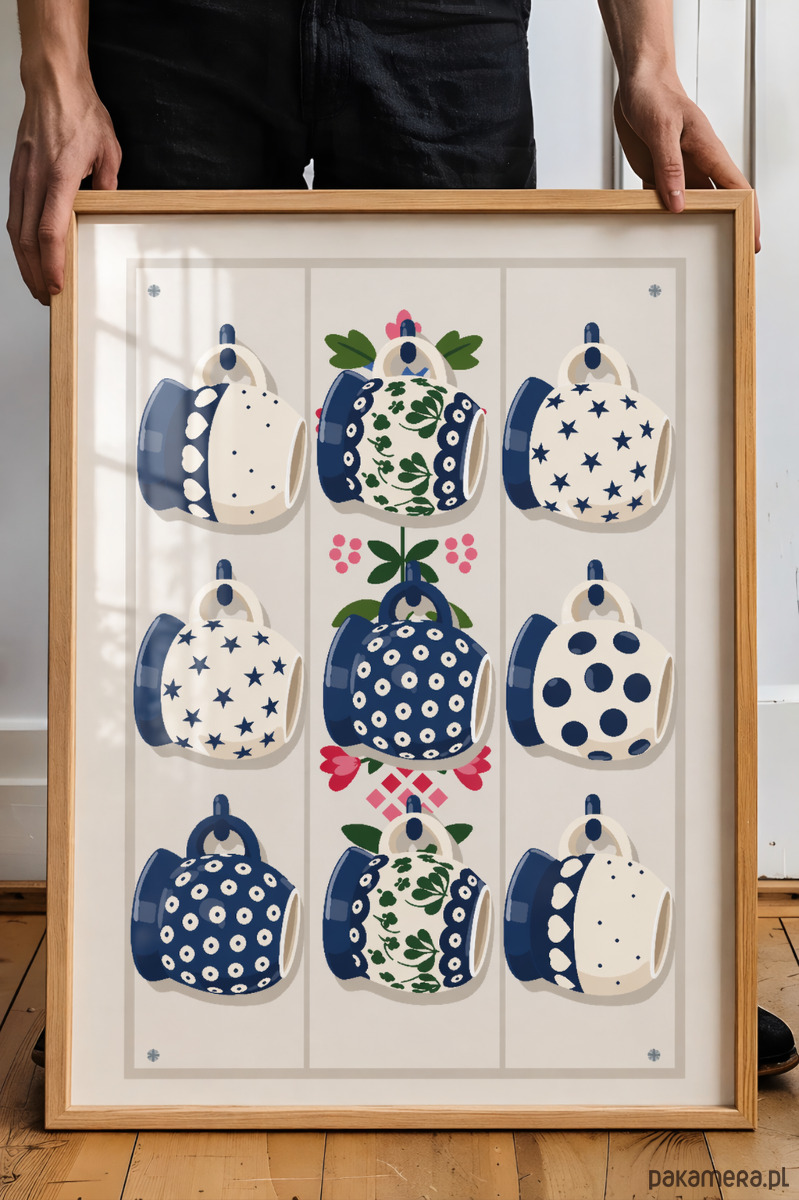 Ten plakat to współczesna interpretacja estetyki Bolesławca czyli wzorów i kolorów, które od lat zachwycają rytmem, detalem. Granatowe motywy, osadzone na jasnym tle, tworzą wyważoną strukturę, która zdobi i nadaje sielskiego klimatu polskiej kuchni.