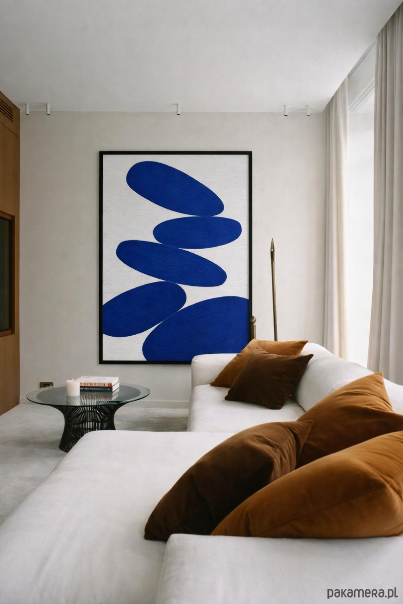 Zestawienie intensywnego ultramarynowego niebieskiego z jasnym tłem przyciąga wzrok i działa jak wizualna kotwica w nowoczesnym wnętrzu. Idealny do przestrzeni utrzymanych w estetyce Japandi, mid-century modern lub artystycznego minimalizmu.