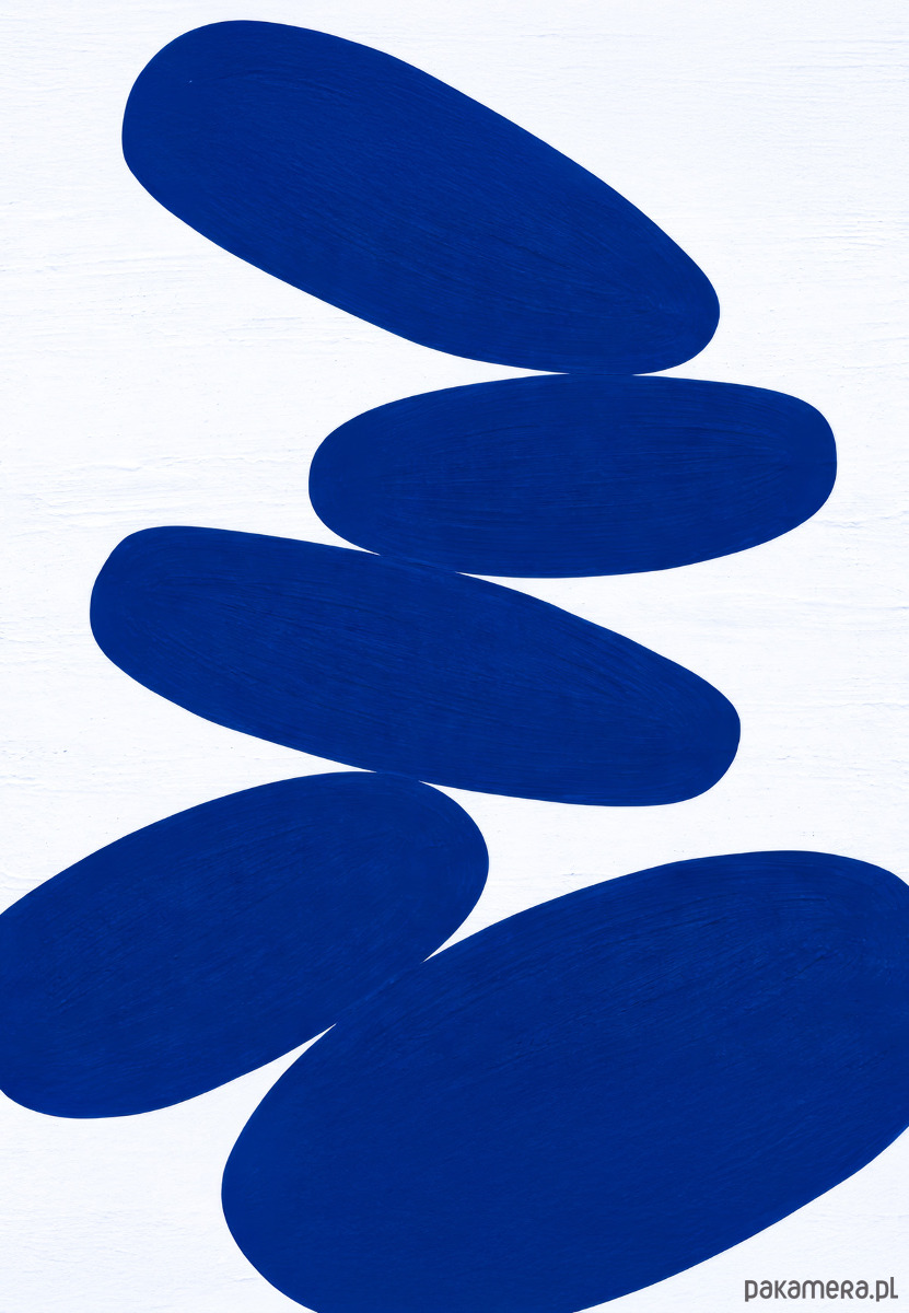 Granatowe formy zawieszone w bezruchu — jakby odbite z natury, ale przefiltrowane przez język współczesnej sztuki. Ten plakat to manifest równowagi i minimalizmu. Sześć organicznych kształtów przypomina kamienie ułożone jeden na drugim, jak zenowska wieża z balansu, która może runąć albo trwać — zależnie od tego, kto patrzy.