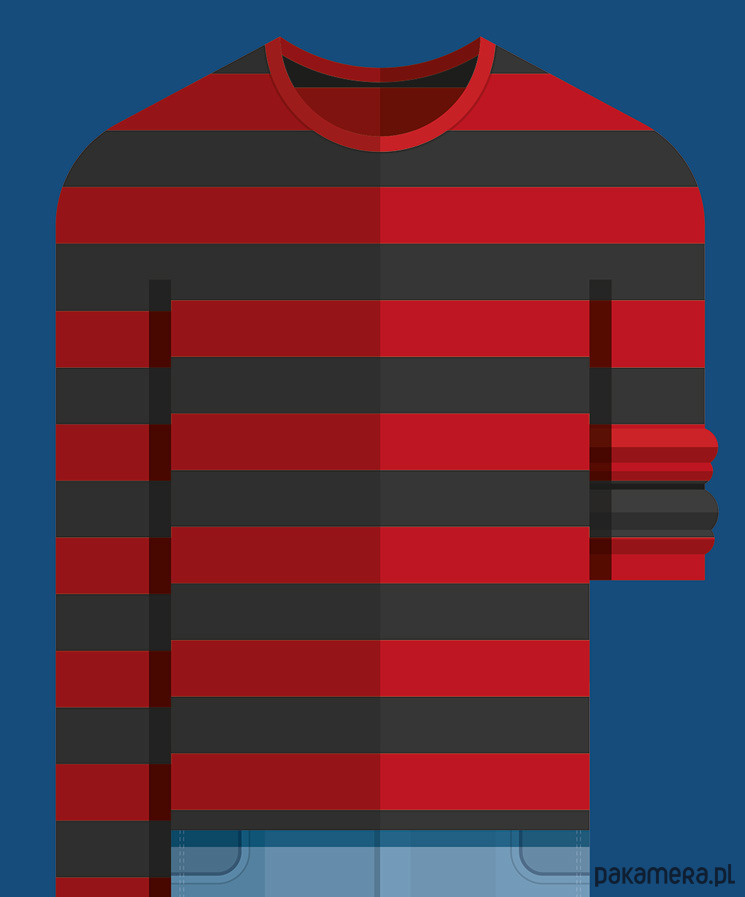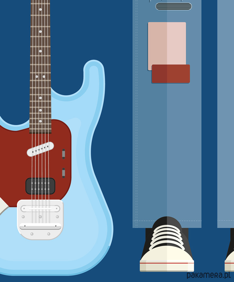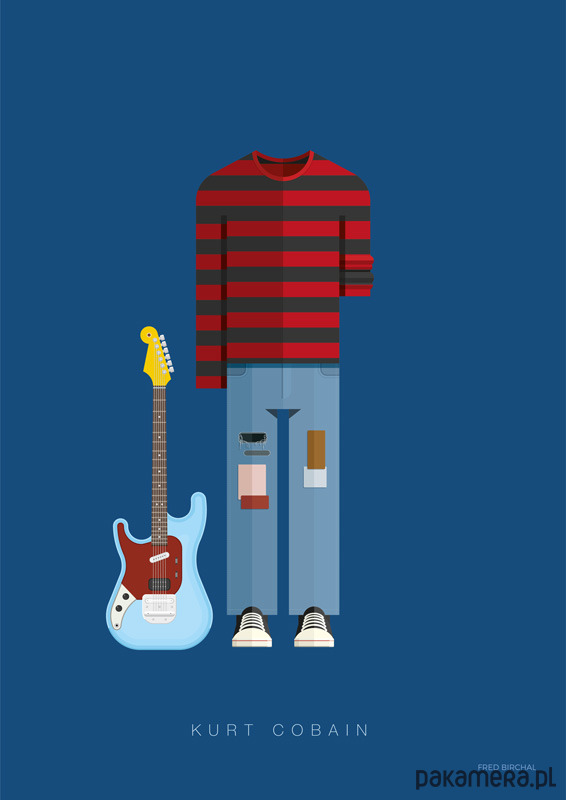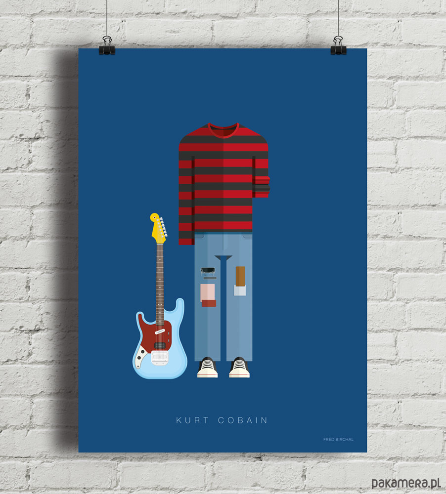 Plakat z autorską grafiką inspirowany Kurtem Cobainem, wokalistą i gitarzystą zespołu Nirvana. Pochodzi z serii "Famous Music Costumes" i przedstawia ikoniczny sweter w czarno-czerwone paski oraz znoszone jeansy.