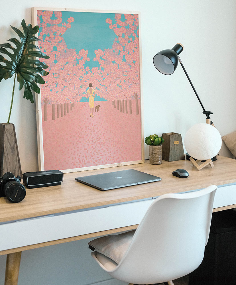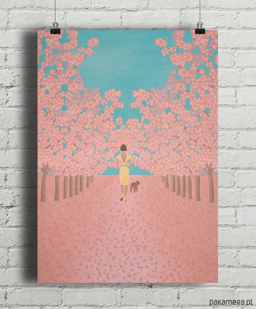 Grafika przedstawia dziewczynę w żółtej sukience spacerującą obsypanymi kwiatami alejkami parku. Różowe korony wiśni odcinają się na tle niebieskiego nieba. Zawieszony na ścianie plakat z kwitnącymi wiśniami wprowadzi do domu wiosenną, radosną atmosferę.