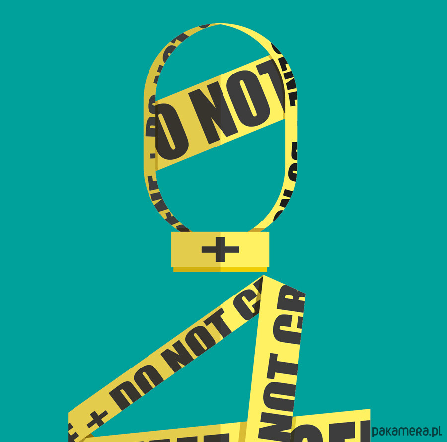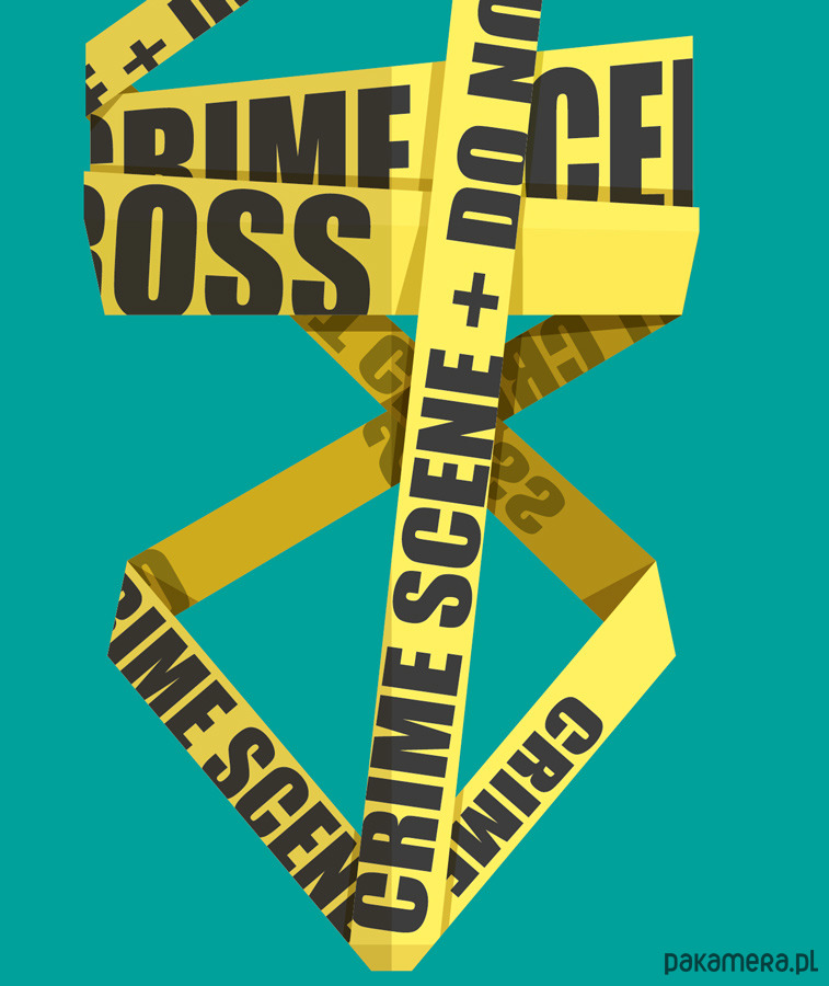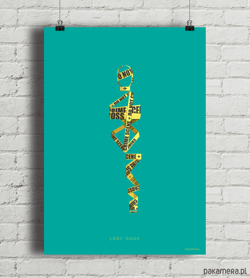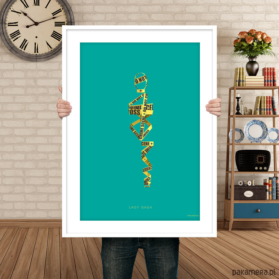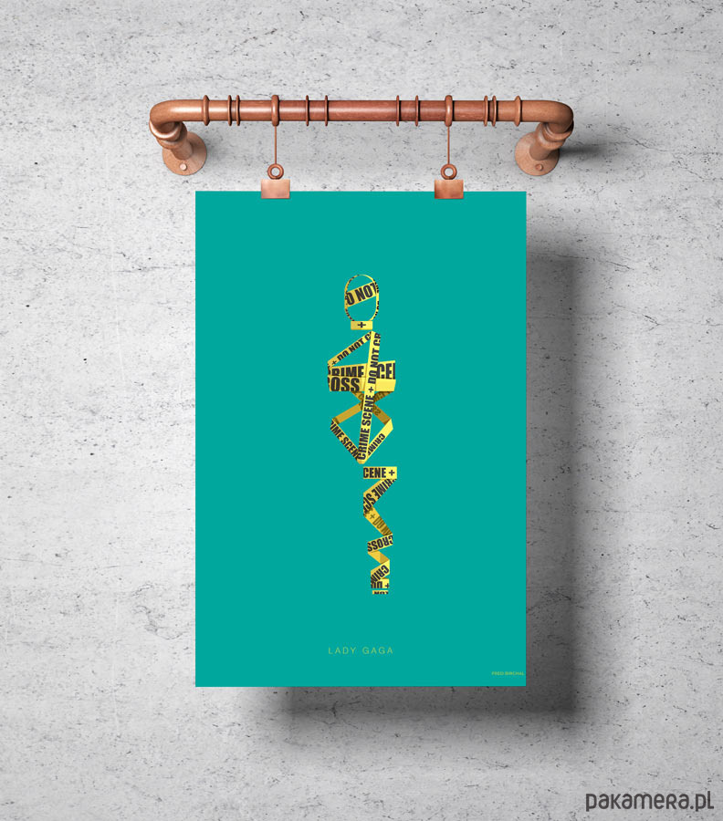 Plakat z autorską grafiką inspirowany wokalistką i autorką tekstów Lady Gaga. Pochodzi z serii "Kostiumy muzyczne" i przedstawia kontrowersyjny strój, w którym artystka wystąpił w teledysku "Telephone" - owinięta żółtą taśmą policyjną z napisem "crime scene, do not cross".