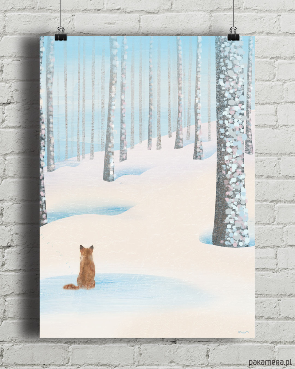 Plakat "Las zimą - lis w śniegu" przedstawia roziskrzony śniegiem poranek w lesie. Wśród bieli kładą się błękitne cienie drzew, a jedynym źródłem koloru jest samotny, młody lis wpatrujący się w tropy na śniegu. Zimowy plakat to idealna dekoracja domu niezależnie od pory roku.