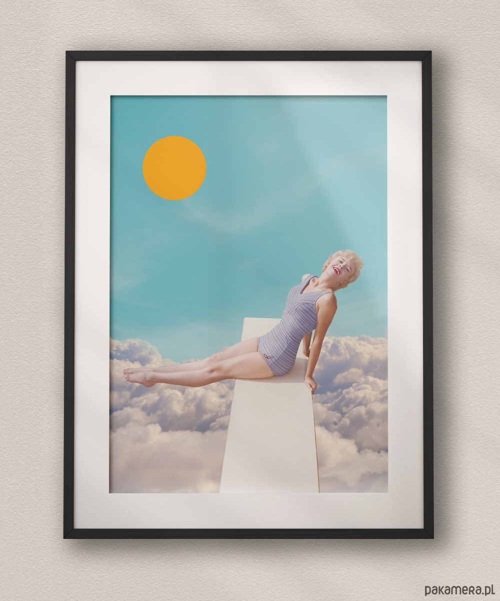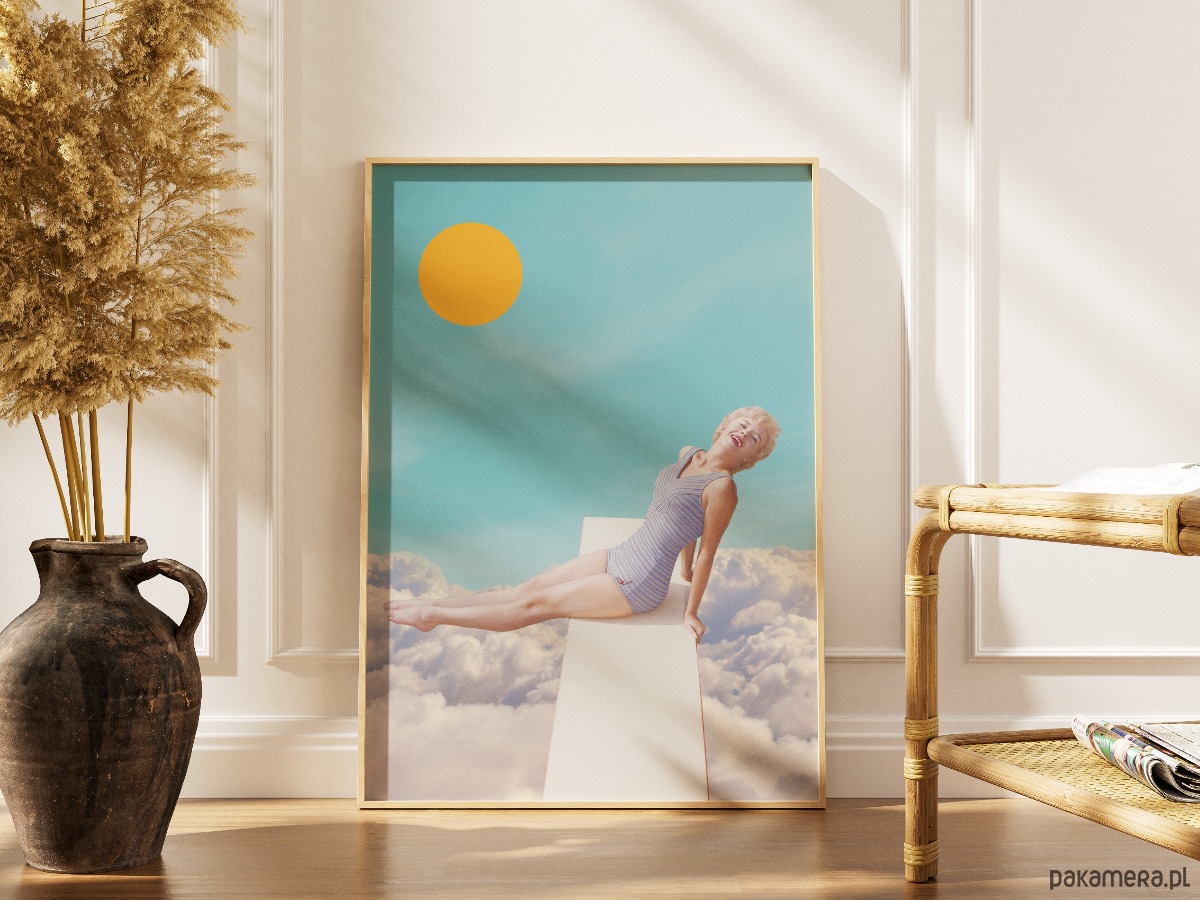Plakat „Lato Trwaj” to minimalistyczny kolaż będący hołdem dla beztroskich chwil spędzonych w promieniach słońca. Kompozycja przedstawia kobietę odpoczywającą ponad chmurami, w świetle intensywnego letniego słońca.