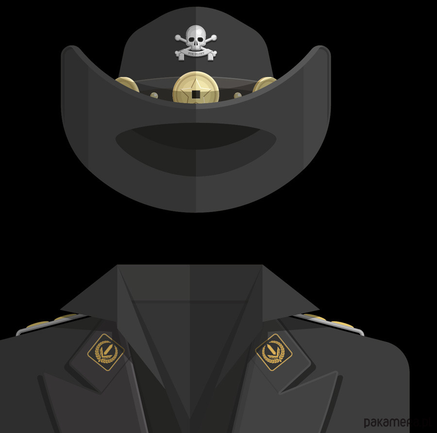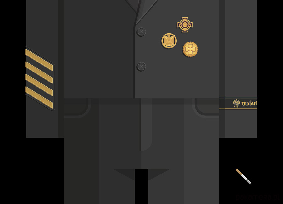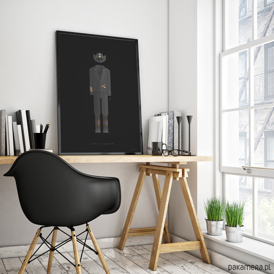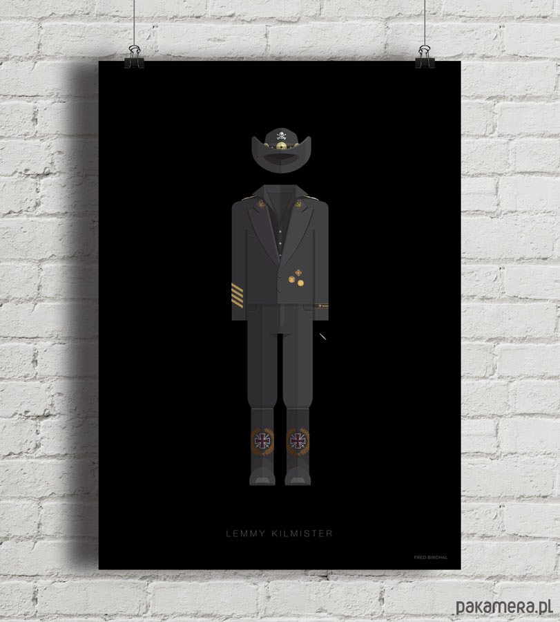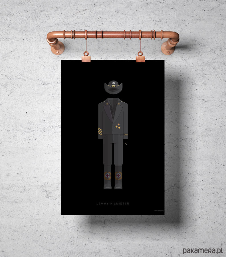 Plakat z autorską grafiką inspirowany wokalistą i basistą Lemmym Kilmisterem. Pochodzi z serii "Kostiumy muzyczne" i przedstawia ikoniczną stylizację muzyka - kapelusz, skórzany strój z mnóstwem emblematów oraz słynne kowbojki.