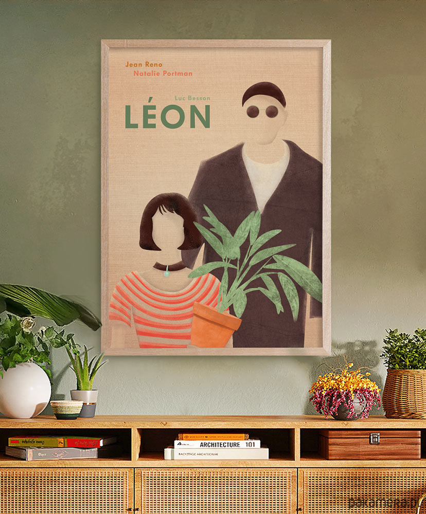 Plakat inspirowany filmem Leon zawodowiec, reż. Luc Besson. Opowieść o przyjaźni płatnego mordercy o gołębim sercu i dziewczynki pragnącej pomścić zabójstwo swojego braciszka na stałe weszła do kanonu kina. Grafika ukazuje dwie główne postacie wspaniale odtwarzane przez Jeana Reno - dla którego rola Leona była stworzona i Natalie Portman debiutującą na ekranie w roli Matyldy.