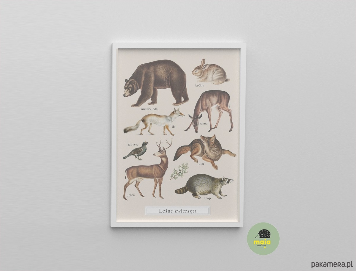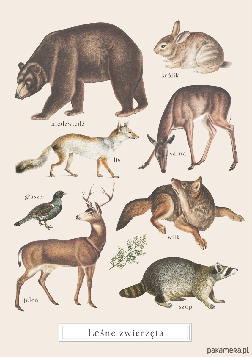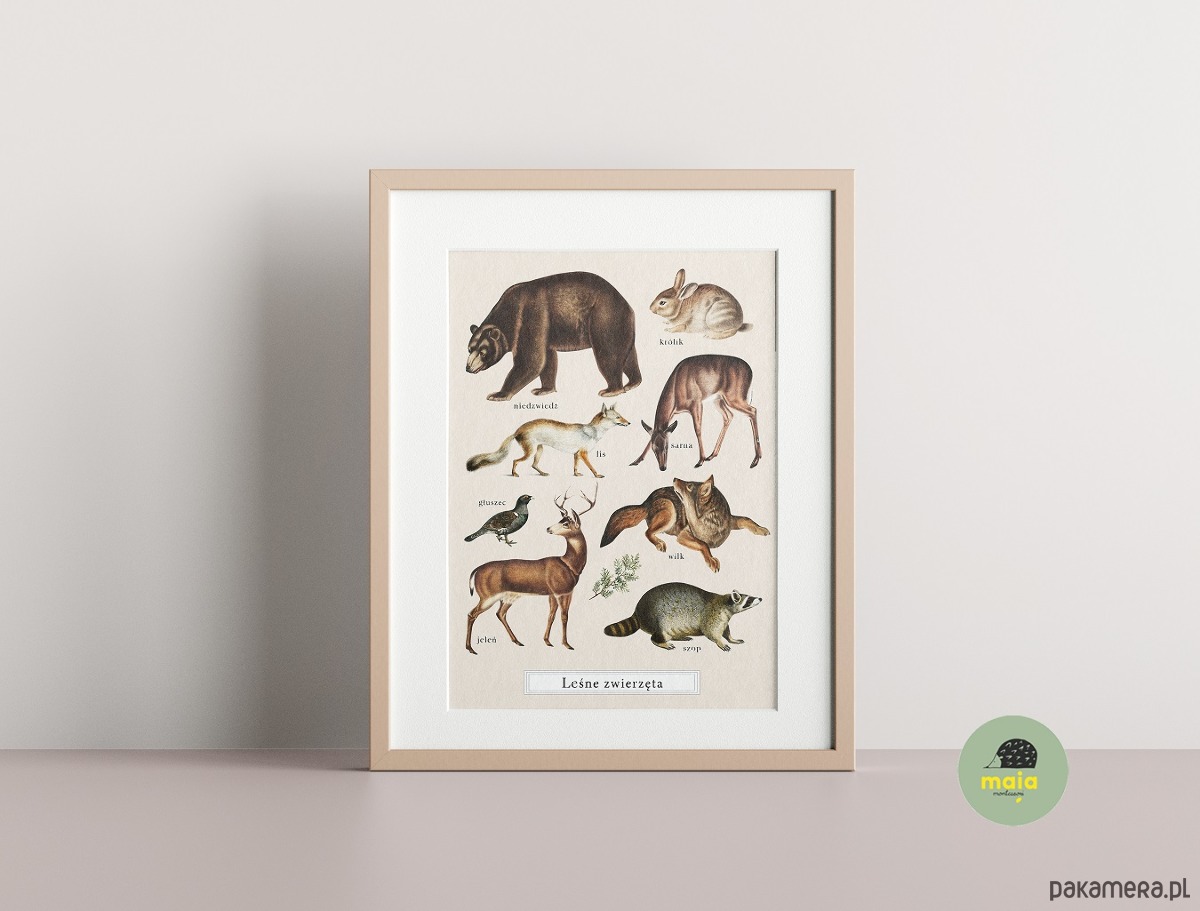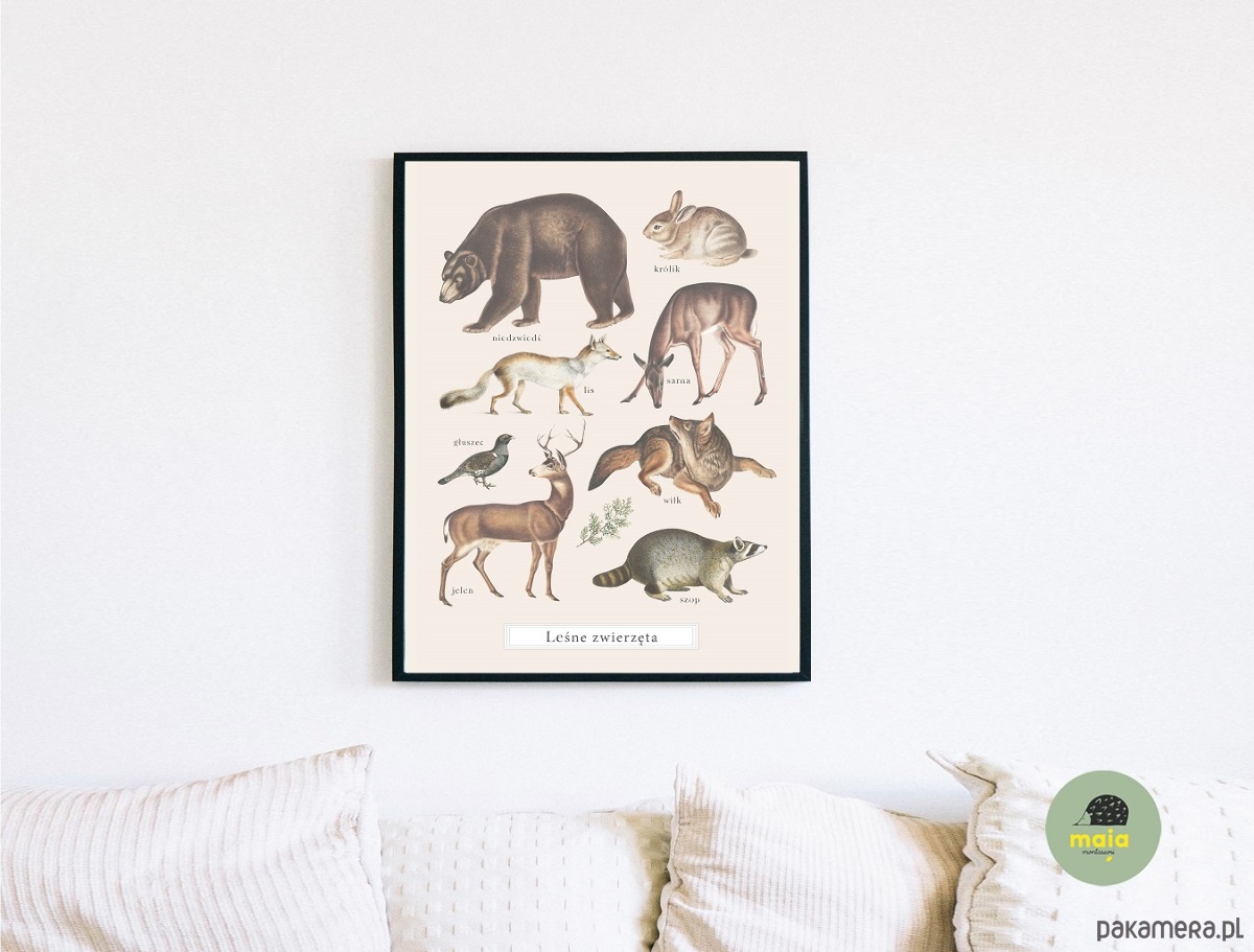 Autorski plakat ze zwierzętami lasu, w klimacie vintage.