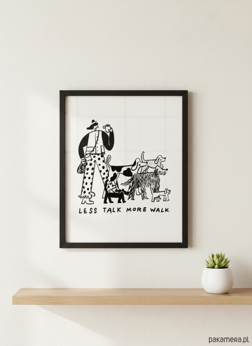 Stylowy plakat autorstwa Oli Jędrzejewskiej, przedstawiający kobietę spacerującą z psami i kubkiem kawy w dłoni. Subtelna, minimalistyczna ilustracja z hasłem „Less Talk, More Walk” idealnie wpisuje się w nowoczesne wnętrza.