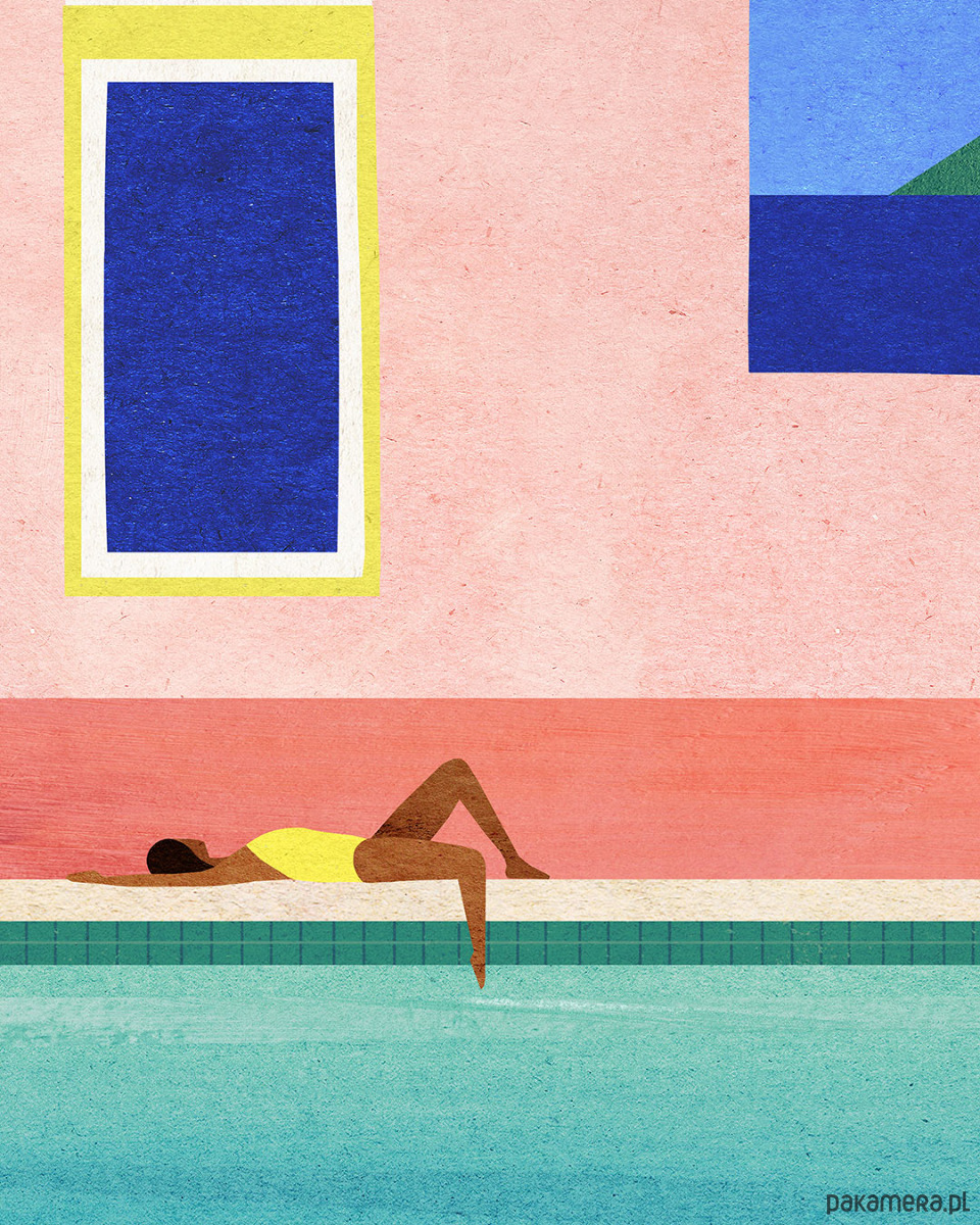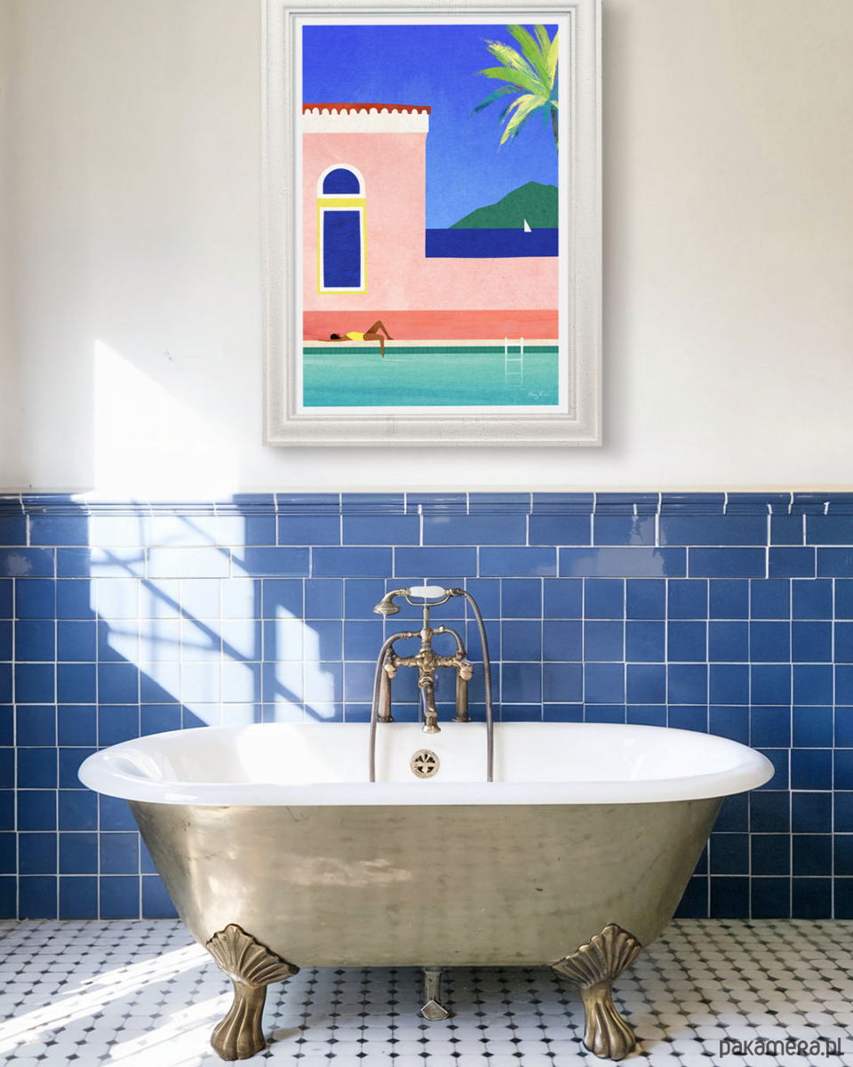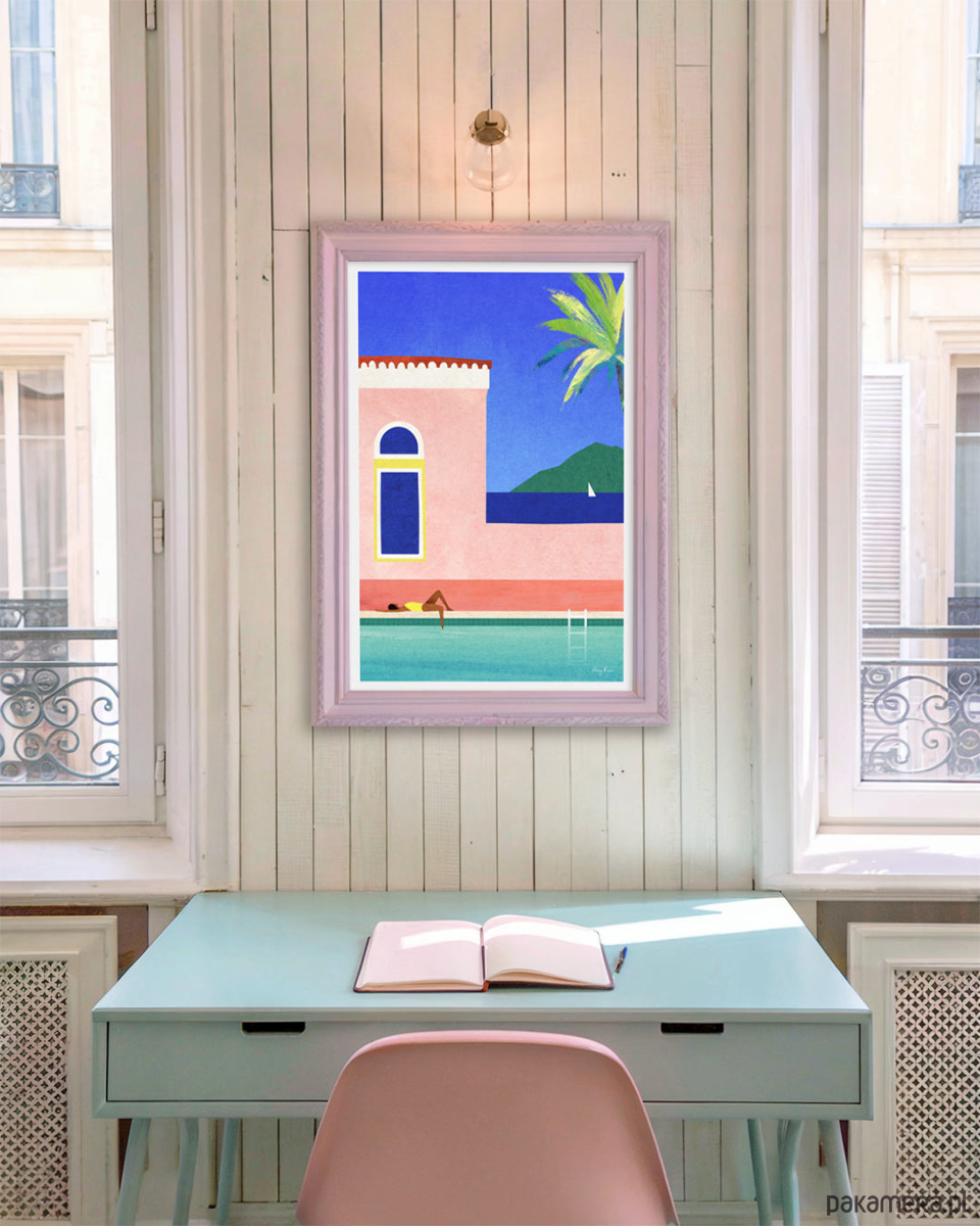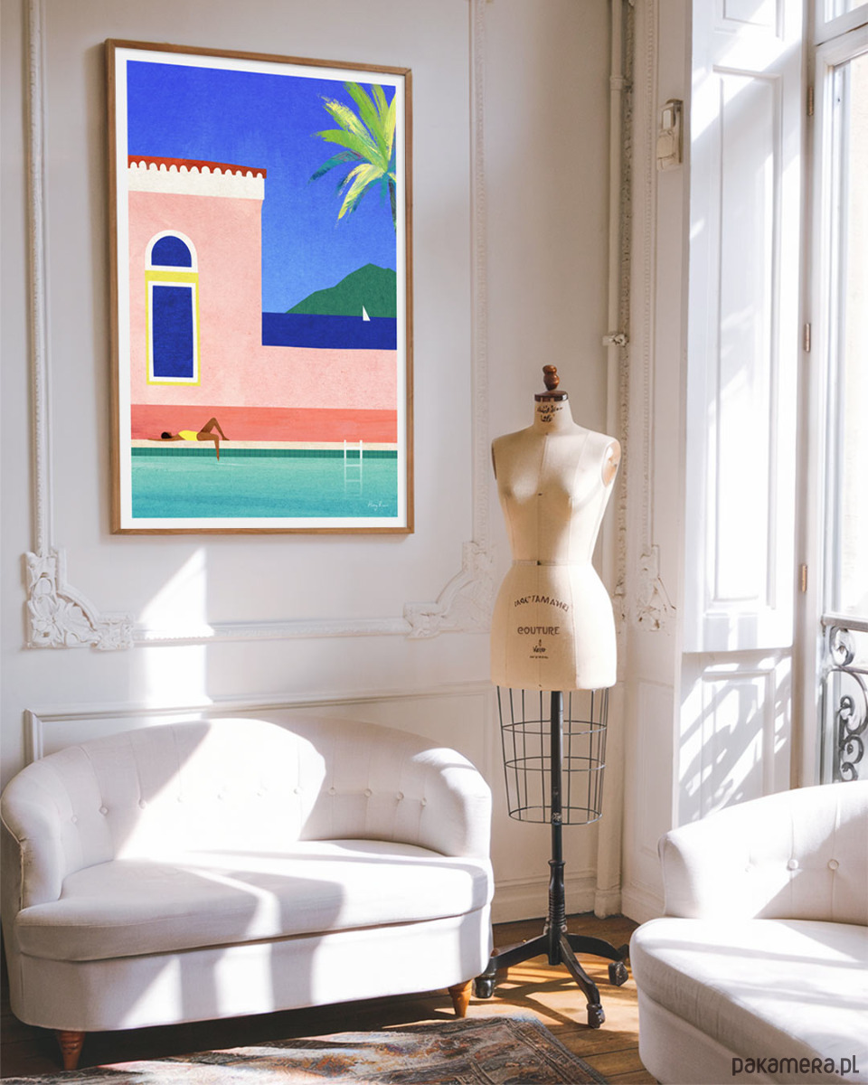 Plakat wypełniony słonecznym blaskiem przywołujący na myśl letnie dni. Willa z basenem zagubiona wśród włoskiego krajobrazu. Dziewczyna w żółtym kostiumie wygrzewająca się w promieniach słońca. Turkusowa woda, która zachęca do ochłody w upalny dzień.