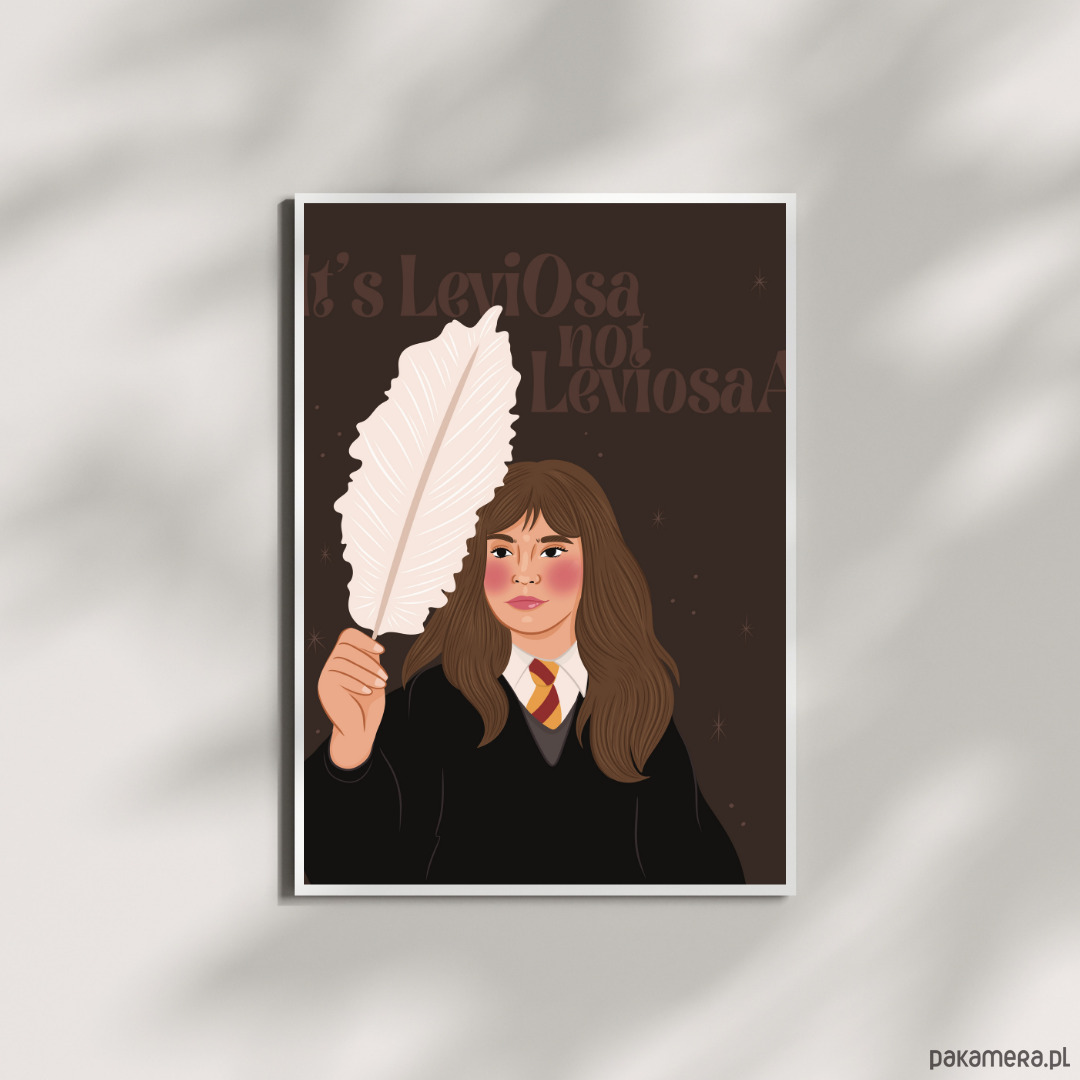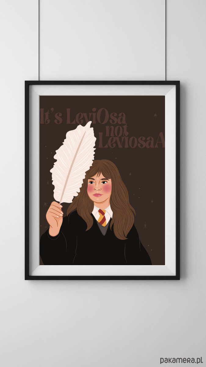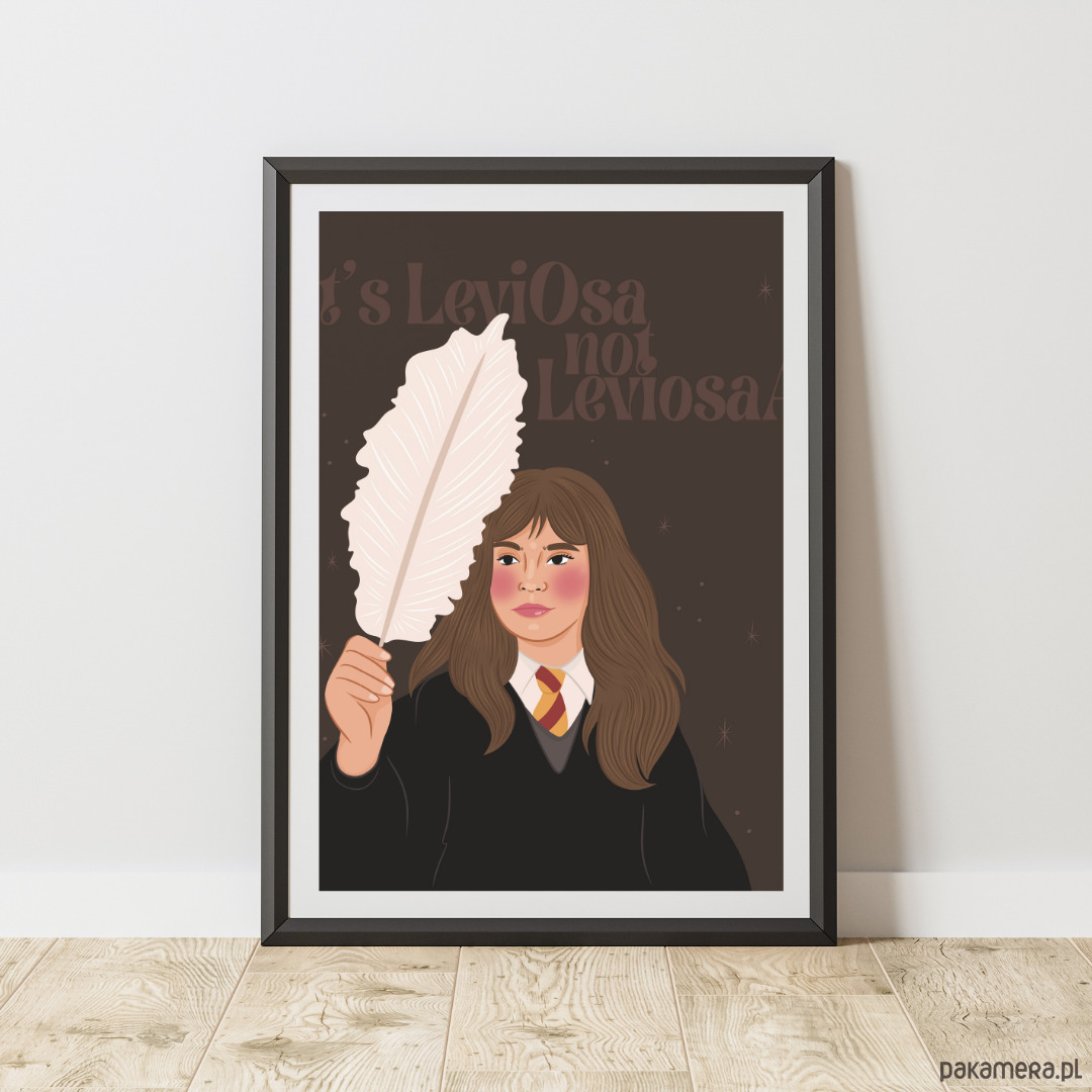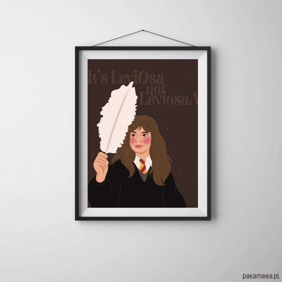 Ten wyjątkowy plakat to artystyczna interpretacja jednej z najbardziej ikonicznych postaci świata magii – Hermiony Granger. Ilustracja ukazuje młodą czarownicę z charakterystycznym piórem i cytatem „It’s LeviOsa, not LeviosA”, który stał się symbolem jej błyskotliwości, determinacji i zamiłowania do wiedzy.