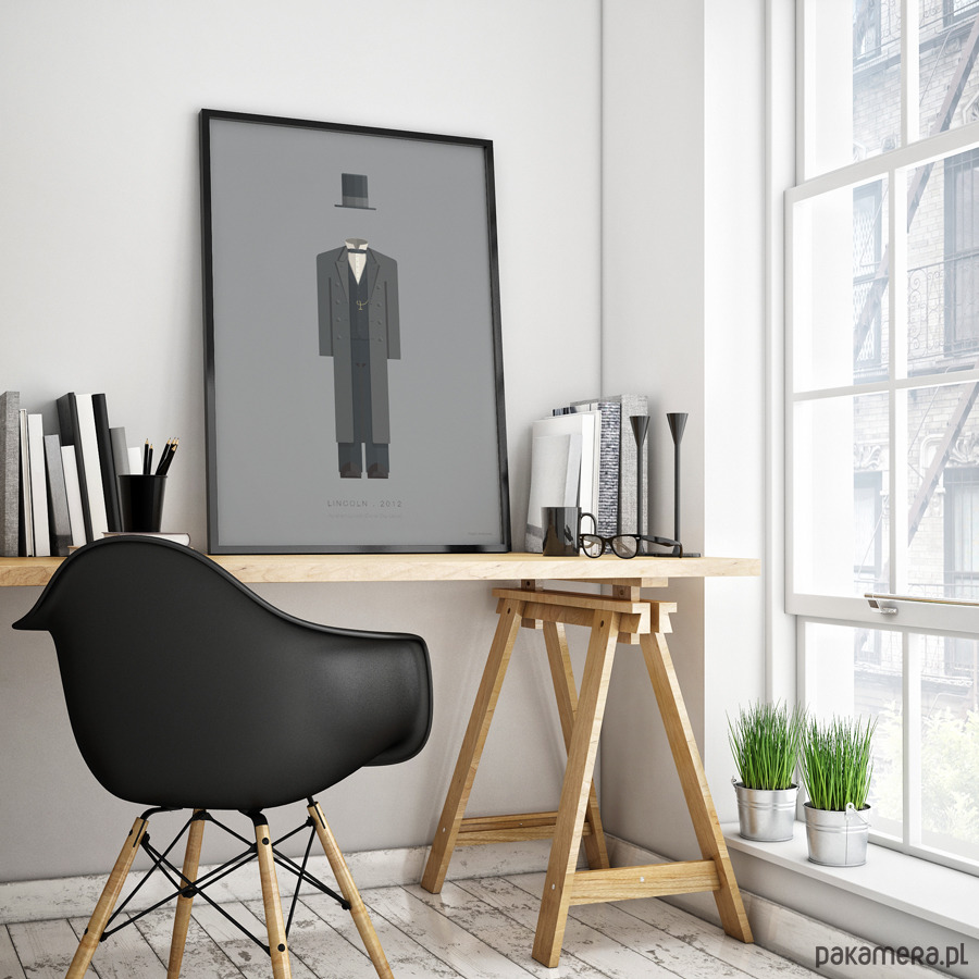 Plakat z autorską grafiką inspirowaną filmem "Lincoln", reż. Steven Spielberg. Pochodzi z serii "Cinema Costumes" (Kostiumy kinowe) i przedstawia charakterystyczny strój Abraham Lincolna.