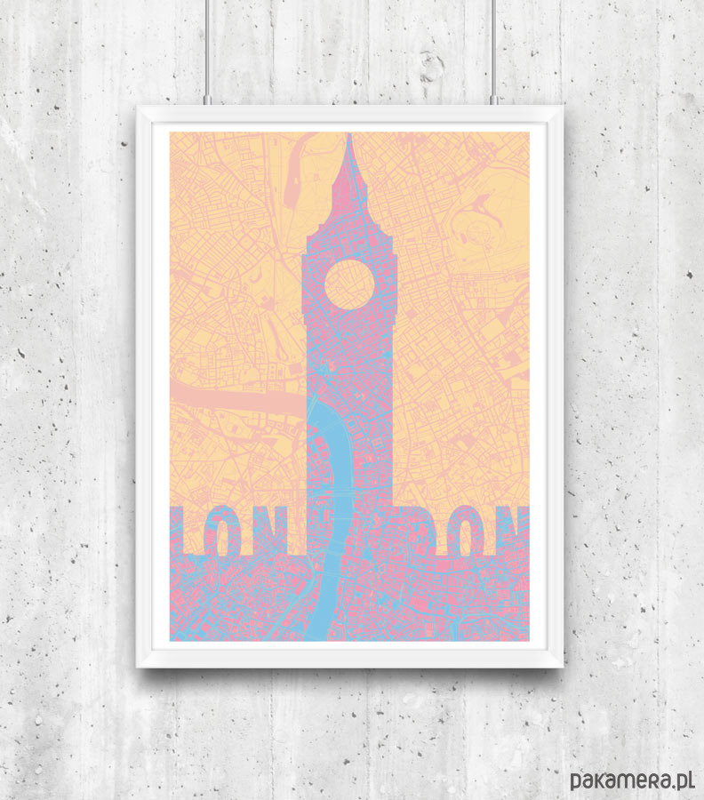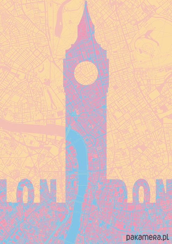Plakat przedstawiający wpisaną w plan Londynu neogotycką wieżę zegarową Big Ben (Elizabeth Tower) przy Pałacu Westministerskim. W tle widoczna jest część miasta między Pałacem Kesington i jego ogrodami na zachodzie, Tower of London na wschodzie, Parkiem Regent na północy i Pałacem Lambeth na południu.