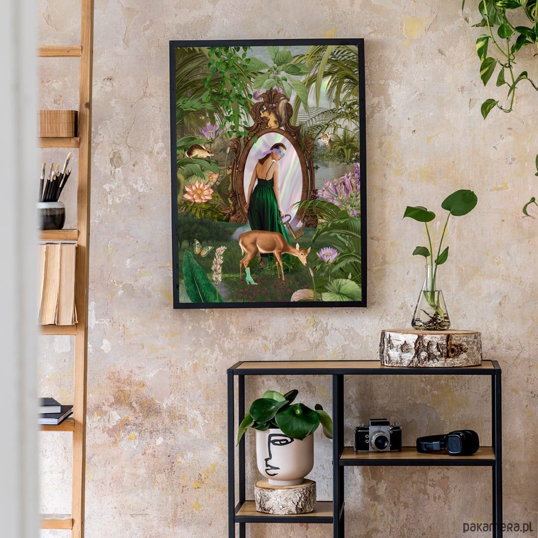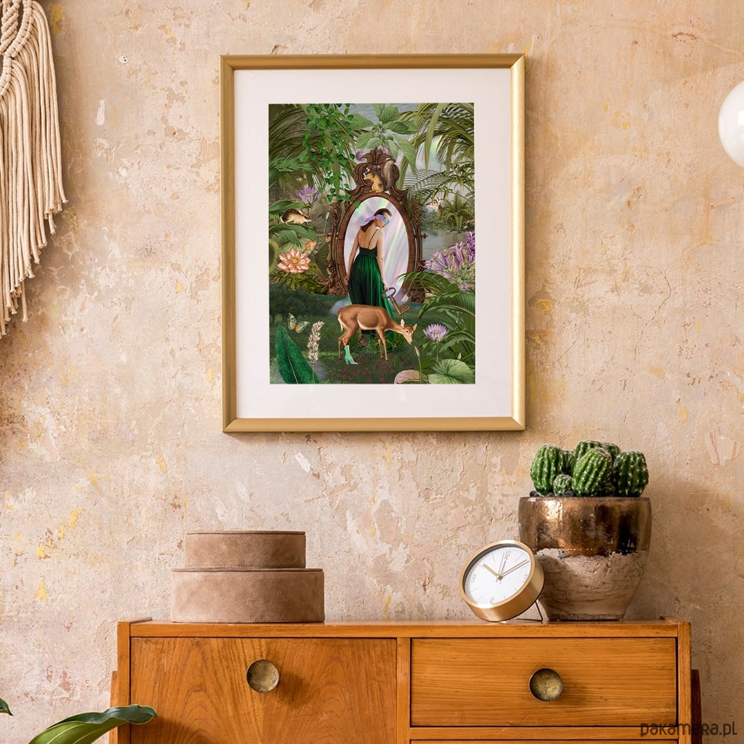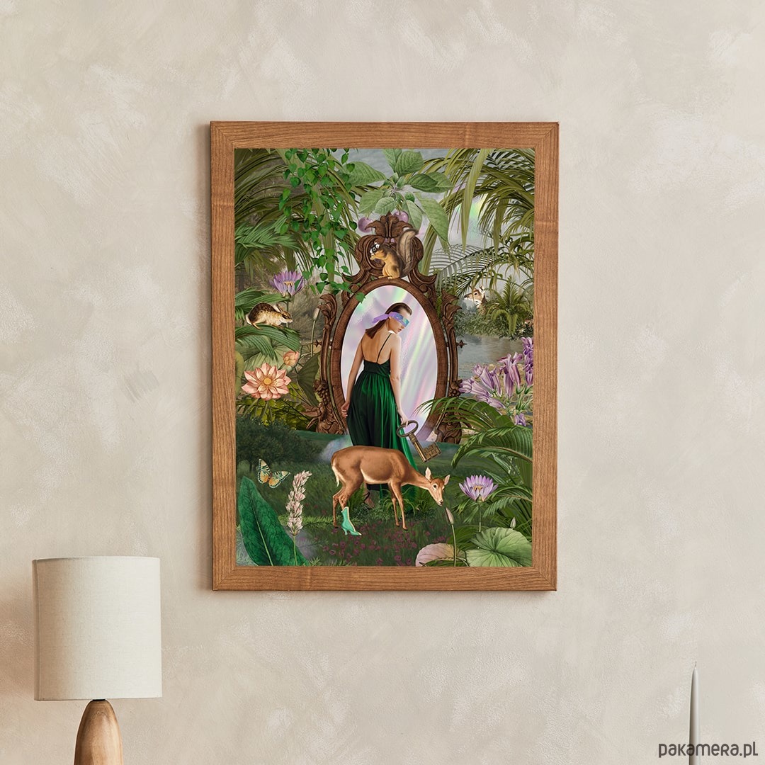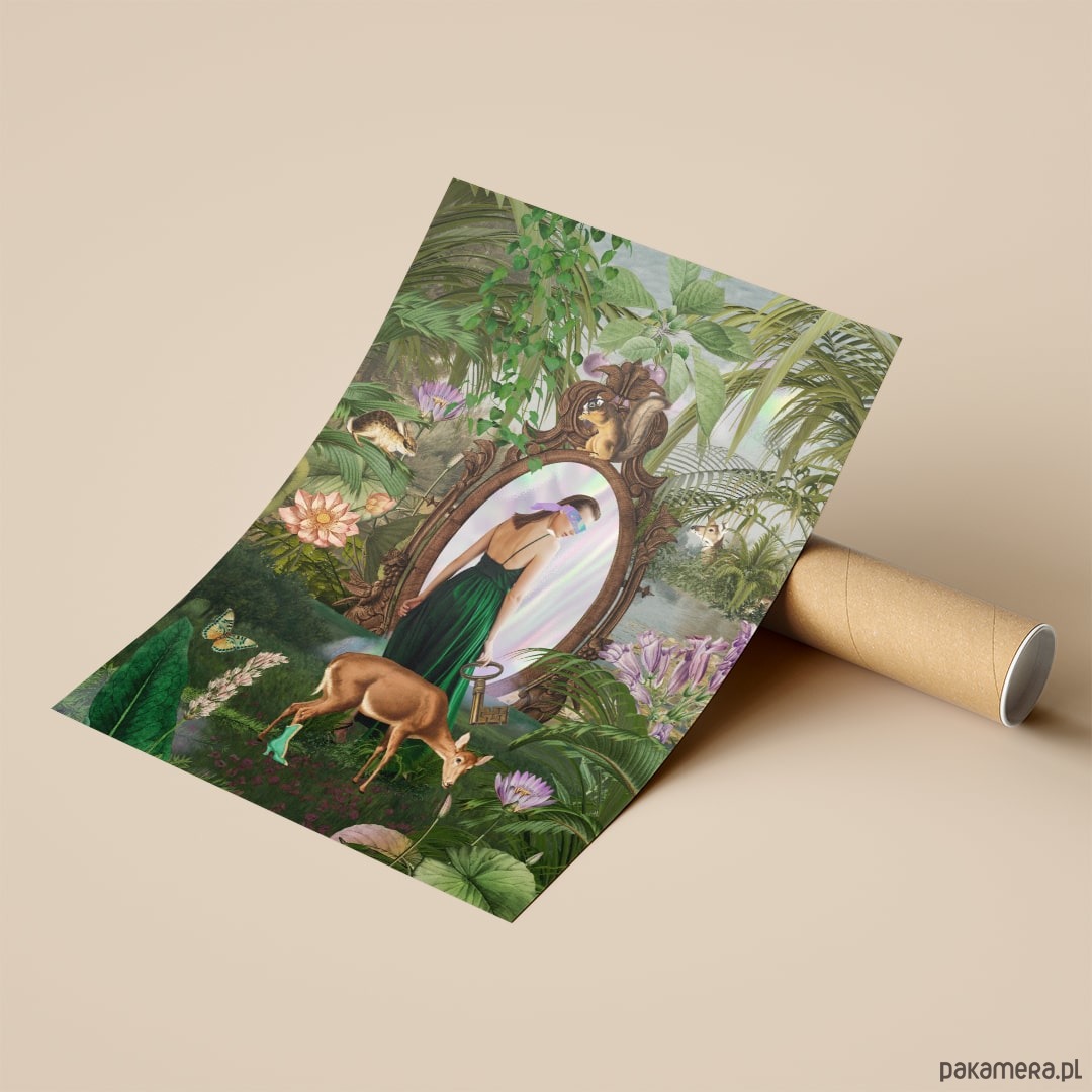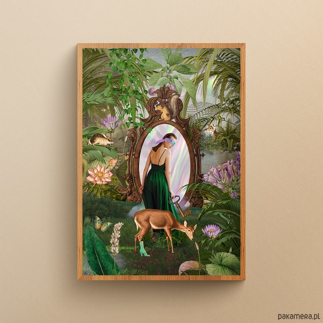 Autorski kolaż "Lustro" jest opowieścią o poszukiwaniu siebie i przekraczaniu własnych granic. O odkrywaniu nieznanego, ekscytacji i jednoczesnym strachu przed nowym. Urokliwa zieleń, wypełniająca całą przestrzeń kolażu zestawiona została z delikatnymi lawendowo - wrzosowymi kolorami. To kolaż o nas samych, o naszej dziecięcej sile i odwadze.