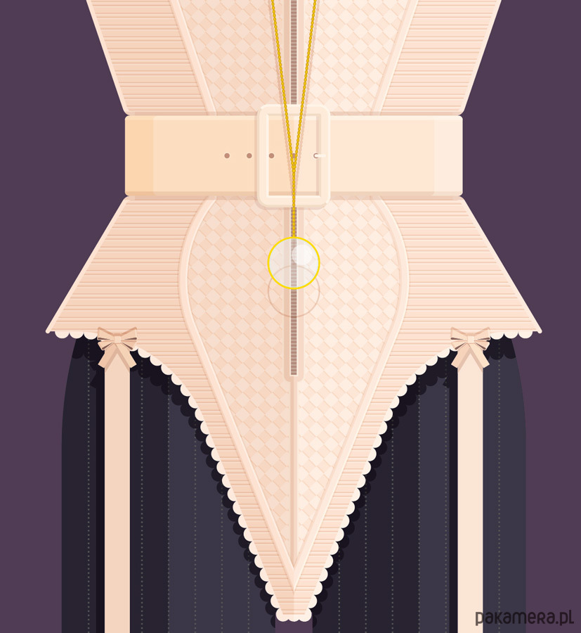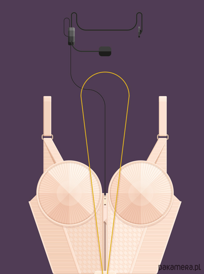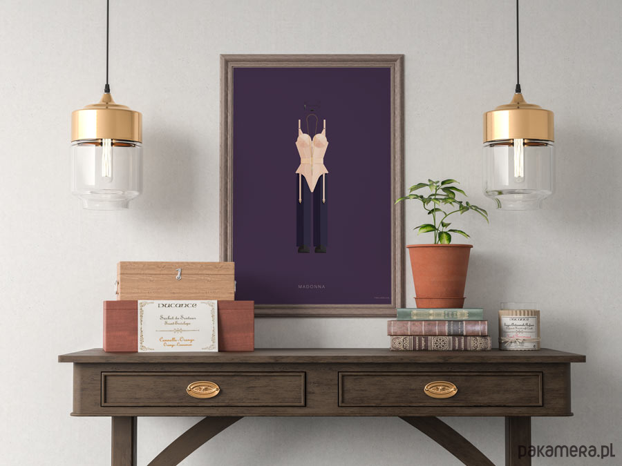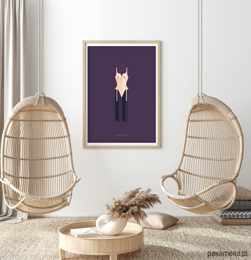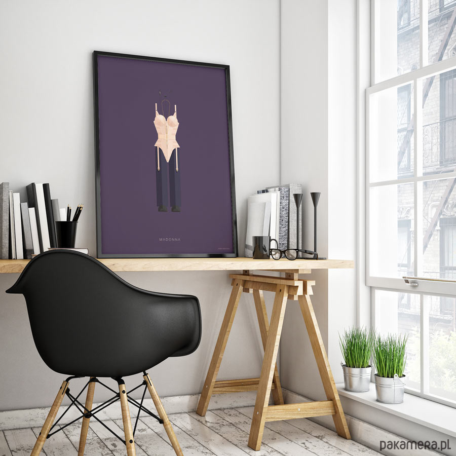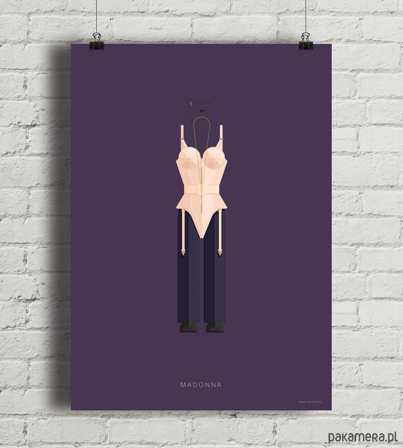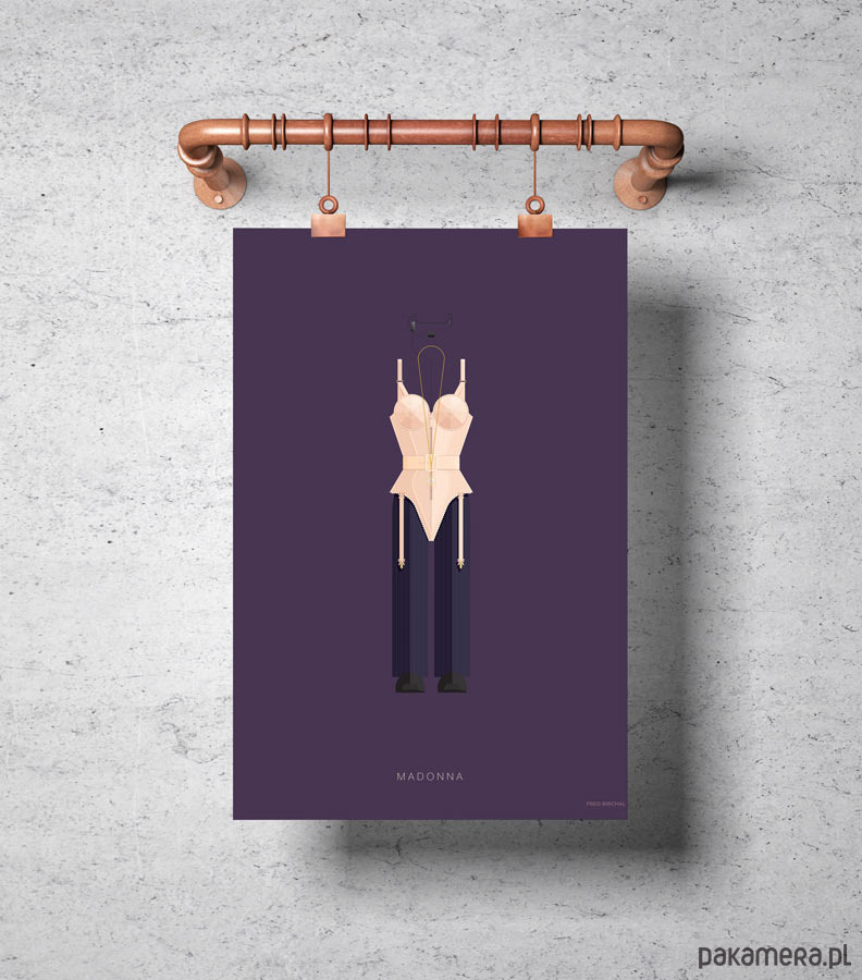 Plakat z autorską grafiką inspirowany "królową popu" Madonną. Pochodzi z serii "Kostiumy muzyczne" i przedstawia słynny strój sceniczny artystki - gorset ze stożkowym stanikiem - zaprojektowany przez Jean-Paula Gaultiera.