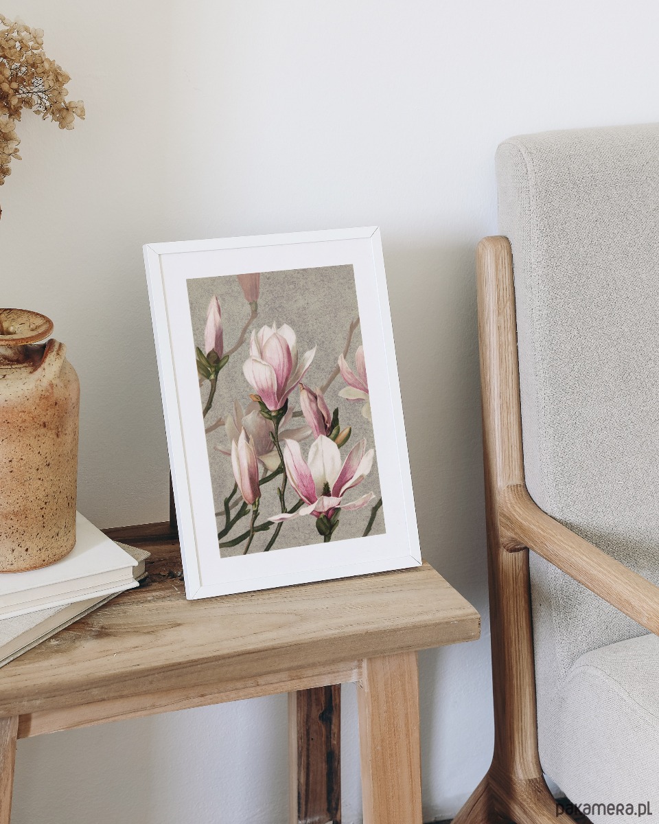 Ilustracja przedstawiająca pięknią Magnolię na szarobrązowym tle. Plakat posiada białe obramowanie podkreślające kompozycję.