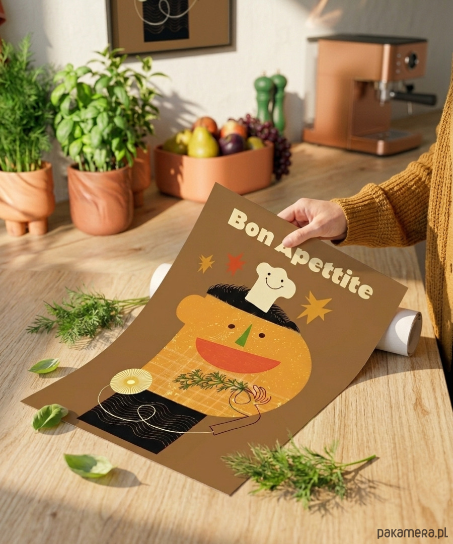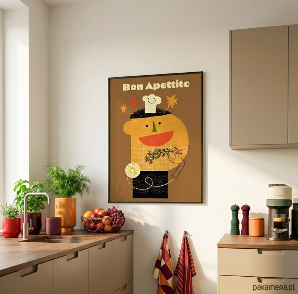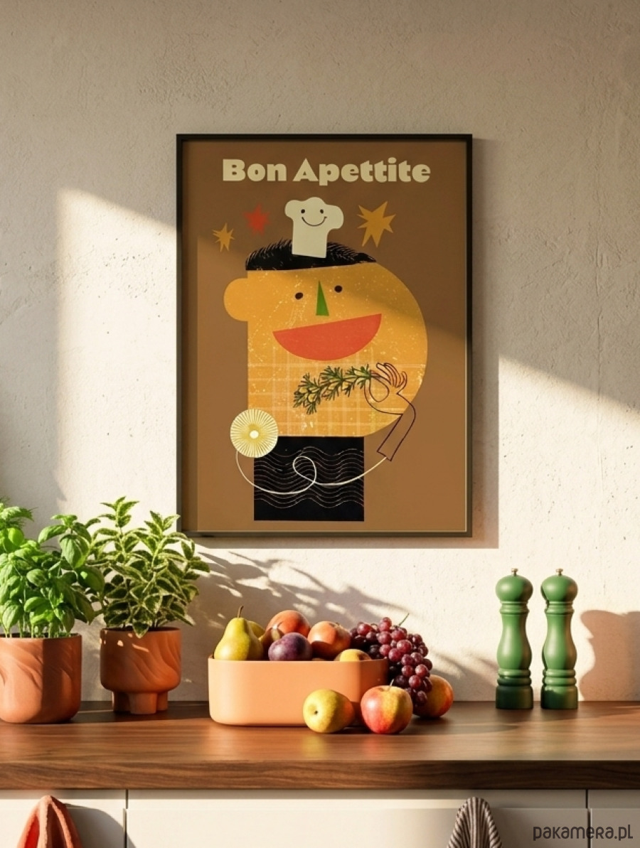 Ten wyjątkowy portret małego kucharza został zaprojektowany w stylistyce nawiązującej do kultowych plakatów z czasów PRL-u. Minimalistyczna forma, odważna kreska oraz ciepła, "kuchenna" kolorystyka sprawiają, że grafika ta stanie się sercem każdej jadalni, restauracji czy klimatycznego baru mlecznego.