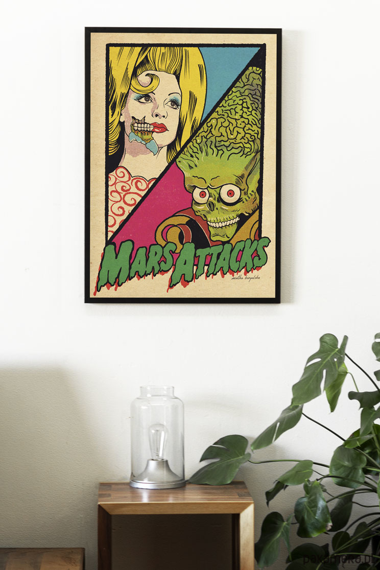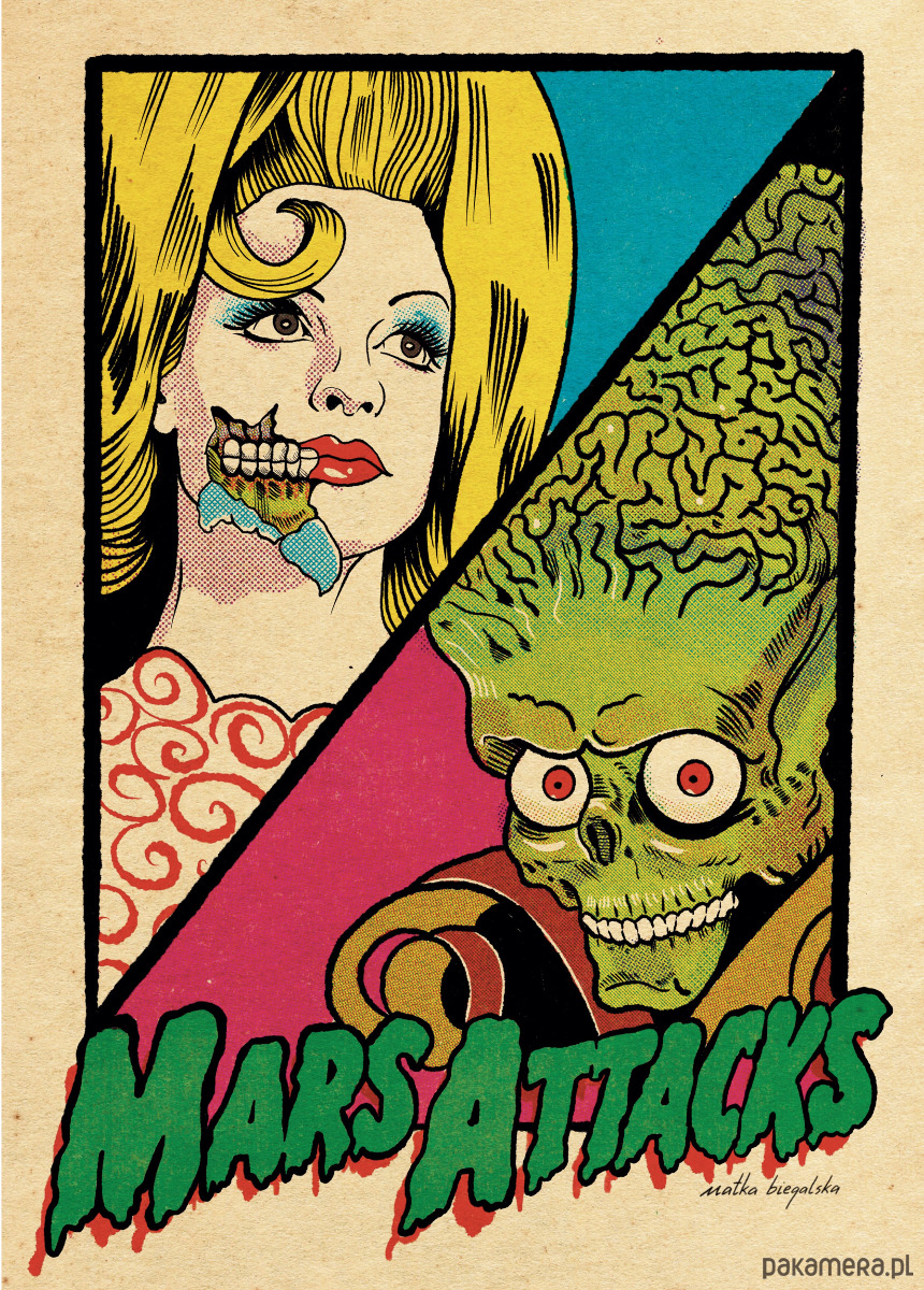 “Marsjanie Atakują” to plakat oddający moje uwielbienie dla Tima Burtona i ulubionej posypki zwanej dobrym kiczem. Plakat utrzymany w retro klimacie, okraszony rastrami i komiksową stylistyką.