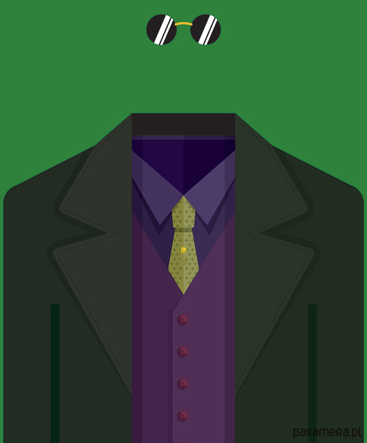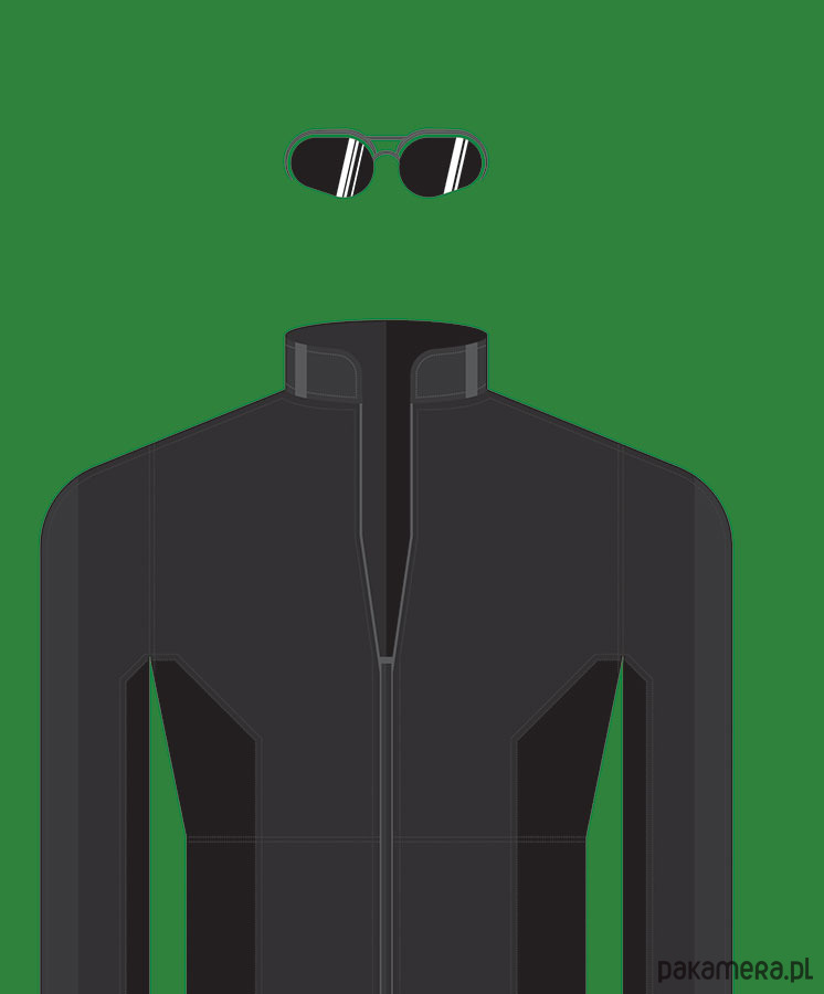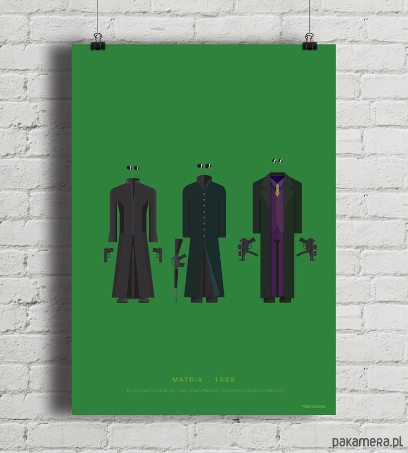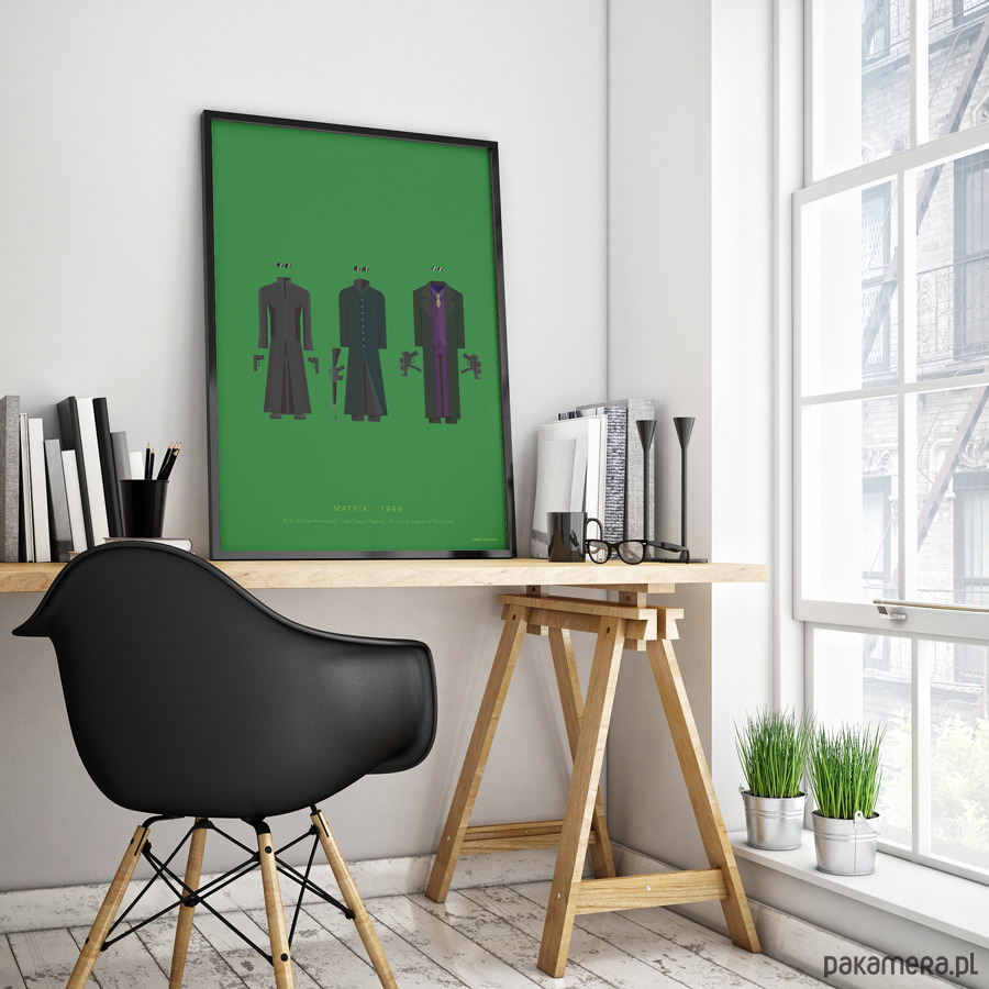 Plakat z autorską grafiką inspirowaną filmem ""Matrix" (The Matrix), reż. Andy Wachowski, Lana Wachowski. Pochodzi z serii "Cinema Costumes" (Kostiumy kinowe) i przedstawia stroje Neo, Morphesua i Trinity.