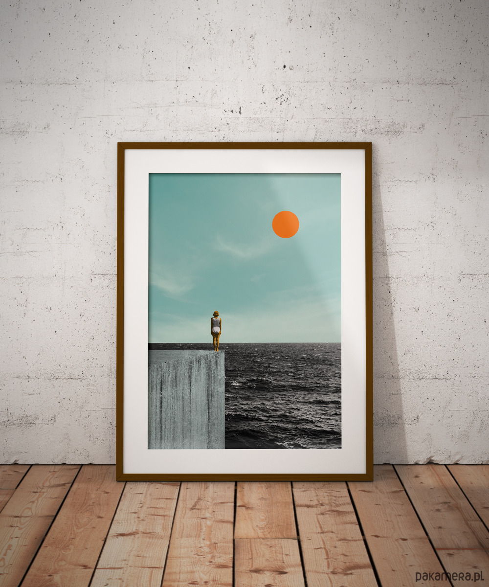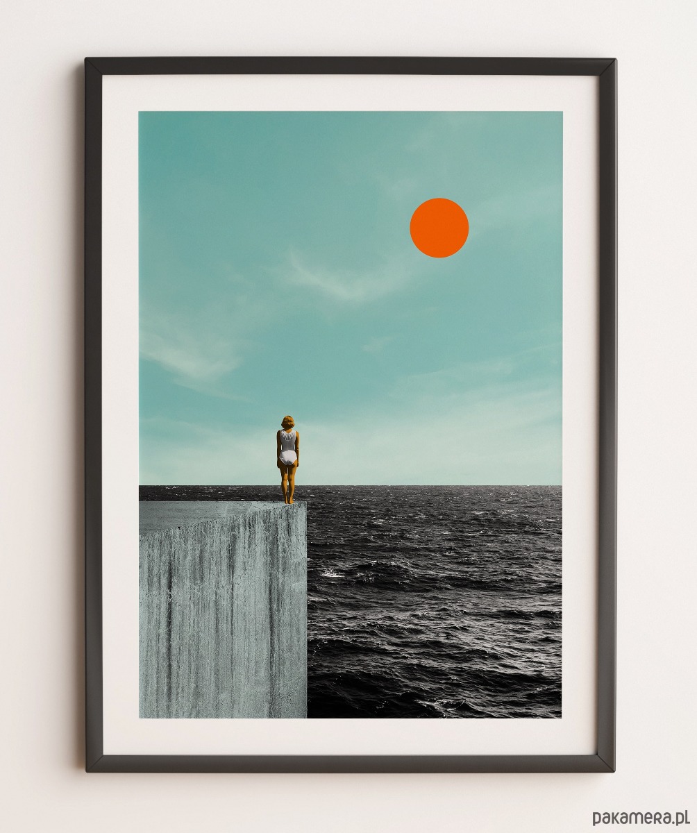 Plakat „Miło Cię znów widzieć” – minimalistyczny kolaż dla miłośników oceanu, ciszy i przestrzeni. Subtelna kompozycja ukazuje człowieka stojącego nad horyzontem, wsłuchanego w szum fal. To wizualna medytacja, która przenosi w stan spokoju i skupienia.