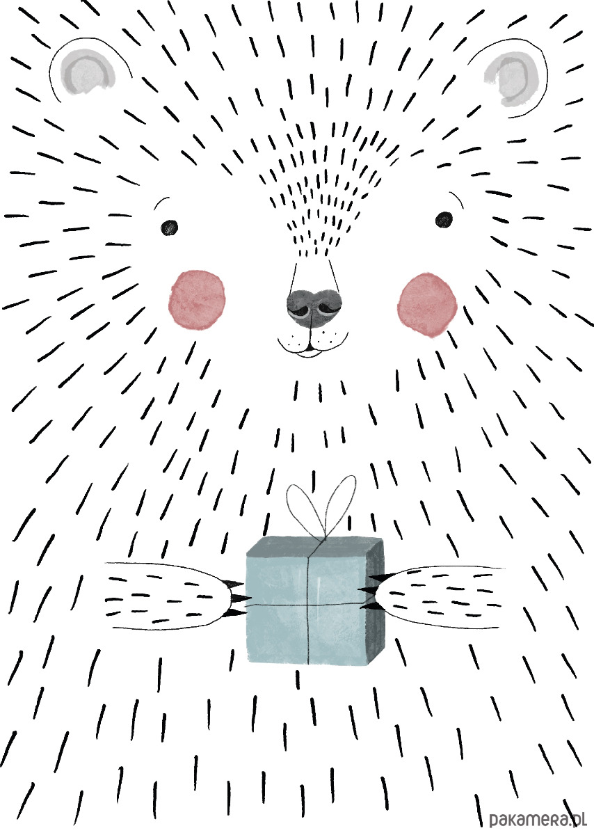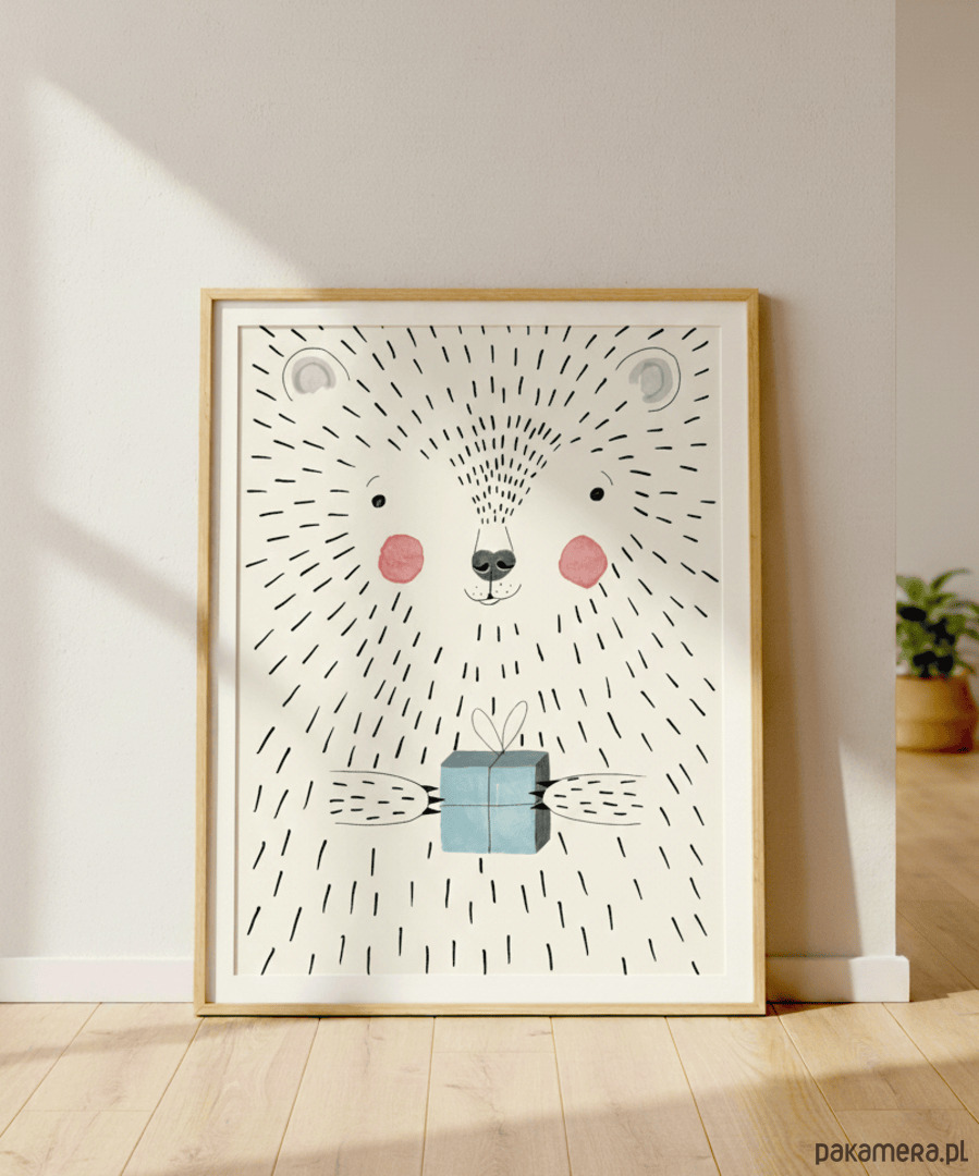 Plakat „Miś z prezentem” projektu Oli Świder to niezwykle ciepła i przyjazna ilustracja, która wprowadza do wnętrza atmosferę radości i dobroci. Wielki biały miś trzymający prezent symbolizuje troskę, miłość i magię dawania — dlatego świetnie sprawdzi się zarówno w pokoju dziecka, jak i jako prezent dla bliskiej osoby.