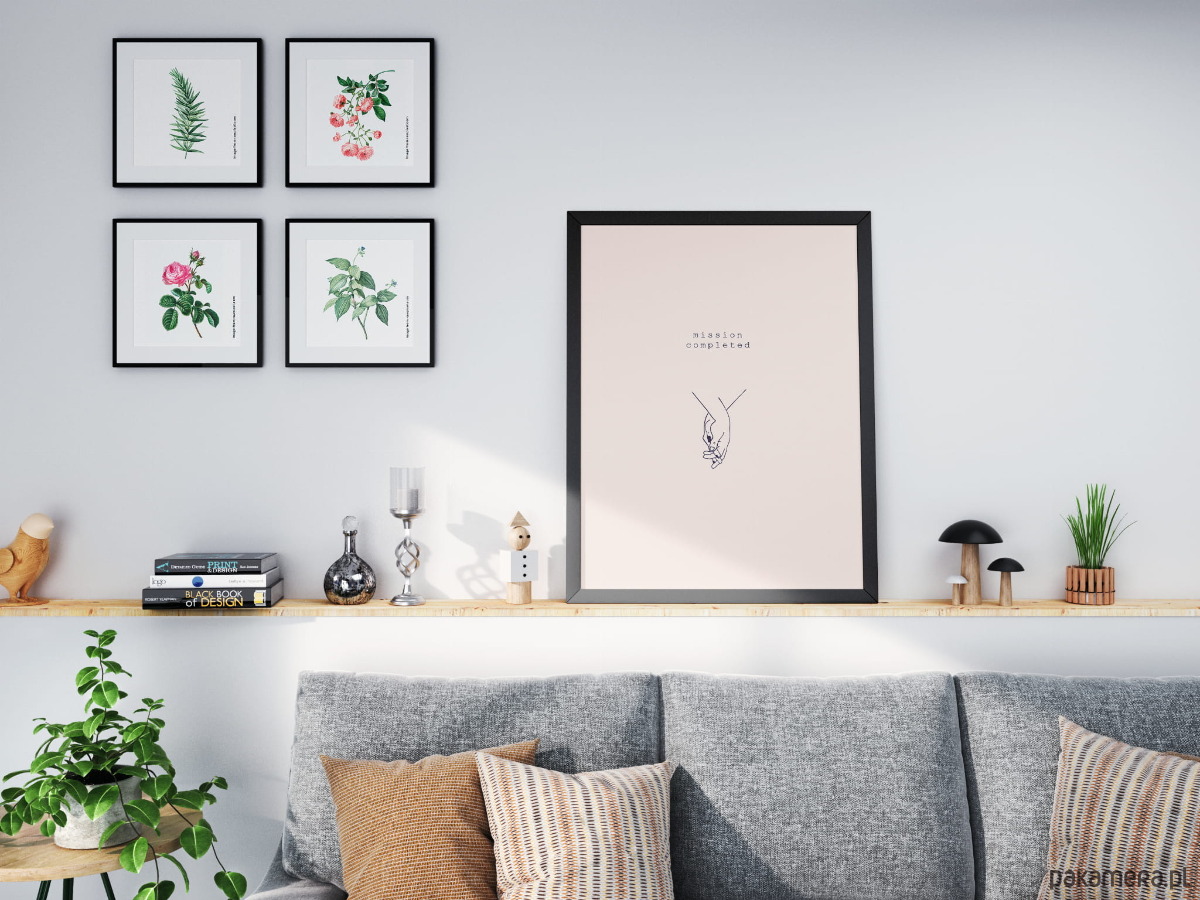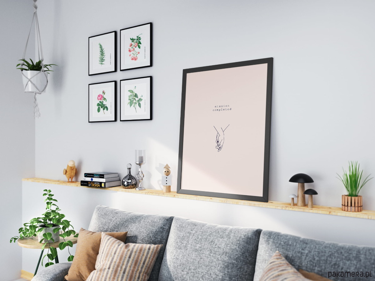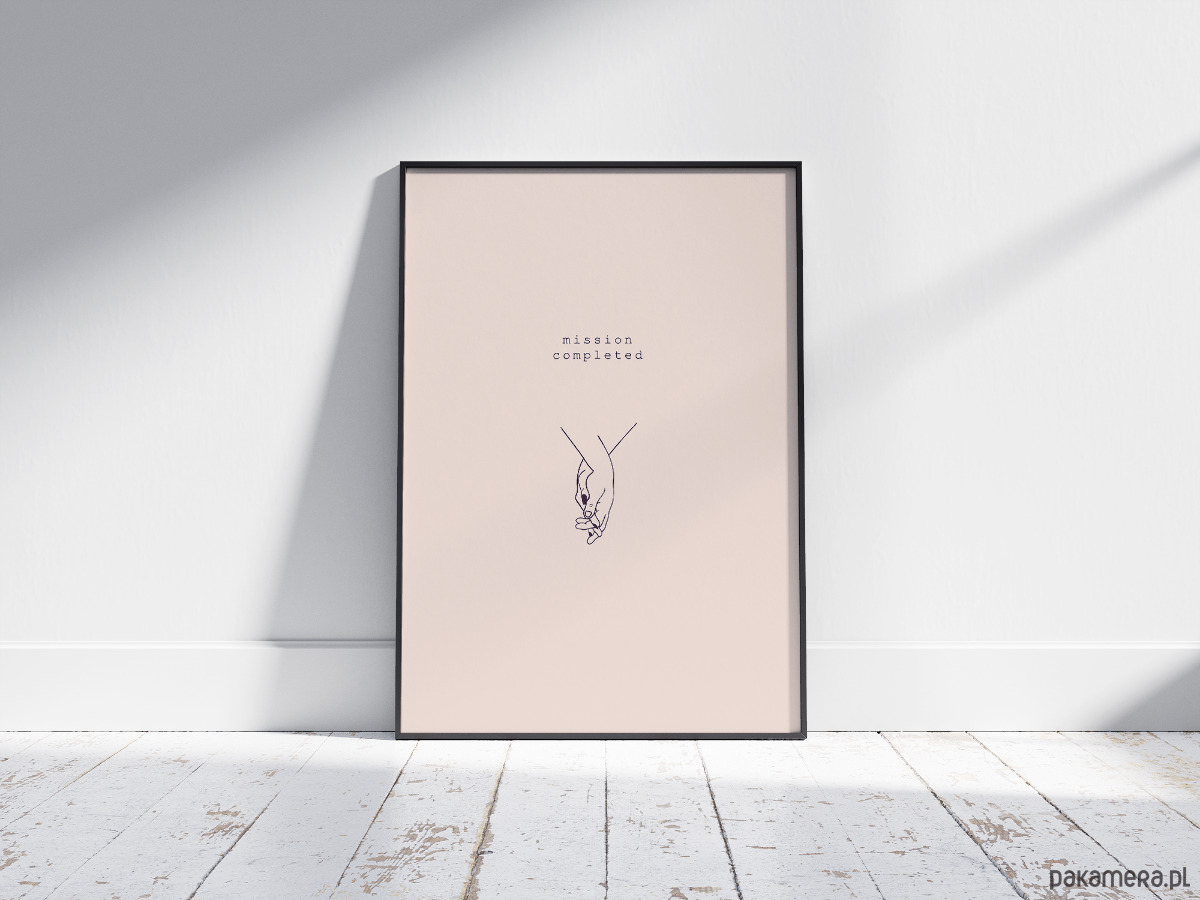 Plakat z napisem "Mission Completed". Minimalistyczna grafika na pudrowo różowym tle.