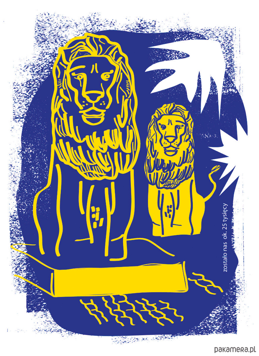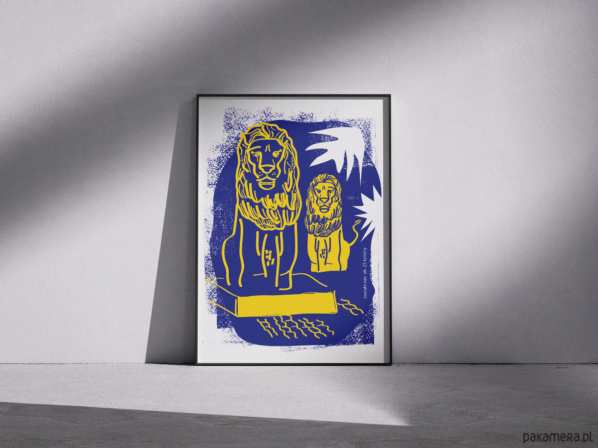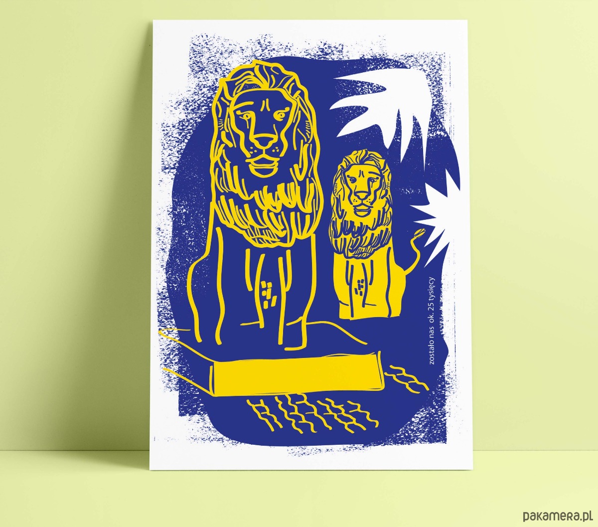 Po rozebraniu kina Moskwa w latach 90 tych lwy zostały uratowane i obecnie stoją na chodniku przy ul. Puławskiej. Plakat "Mokotowskie lwy" jest częścią cyklu "Zwierzyniec Warszawski II", który przedstawia słynne zwierzęta Warszawy. Lwów zostało na świecie ok. 25 tyś. szt. i ta informacja jest również umieszczona na plakacie. Powstał na cześć tych majestatycznych zwierząt. Plakat dostępny w różnych wymiarach, drukowany w limitowanej serii 50 szt. Praca pasować będzie do wnętrz nowoczesnych i minimalistycznych ale także ekstrawaganckich. Może szczególnie spodobać się podróżnikom i miłośnikom przyrody. Będzie pasować do sypialni i salonu, a także przedpokoju.
