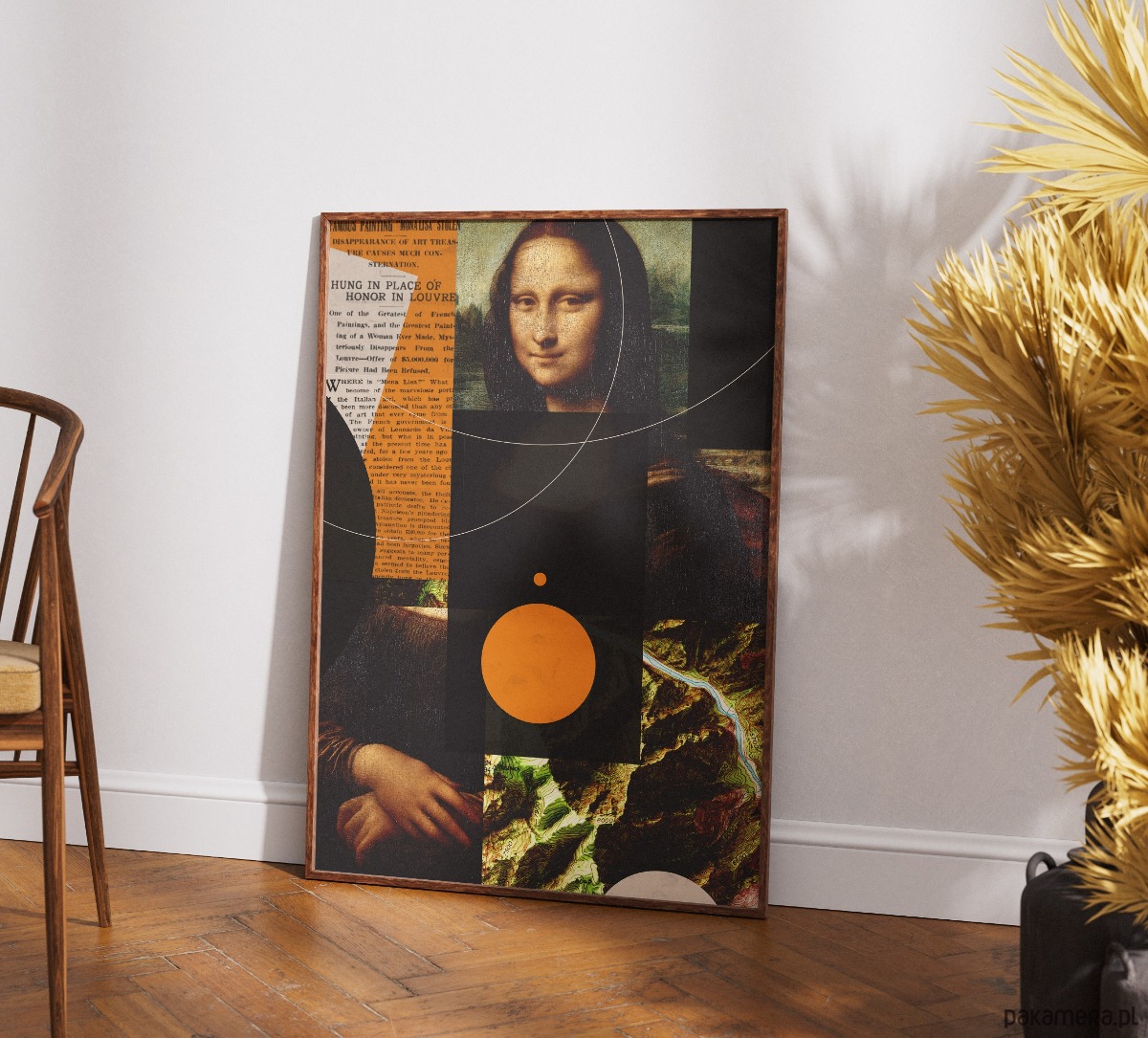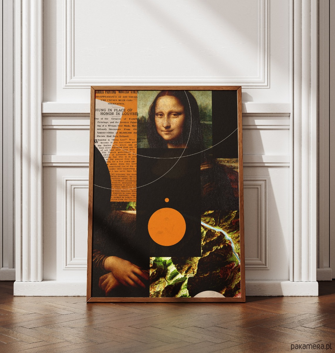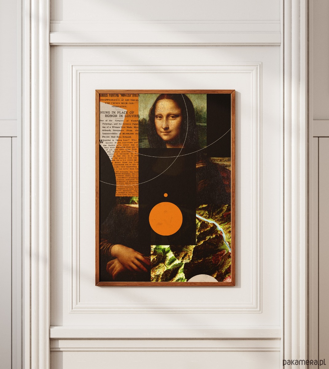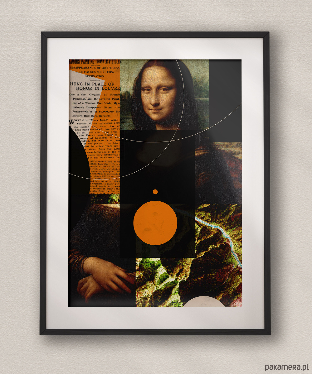 To fascynujący, wielowarstwowy kolaż. Łączy w sobie kilka zupełnie różnych światów: klasyczne malarstwo z "Mona Lisą", vintage'owy artykuł prasowy o jej kradzieży, mapy topograficzne oraz czystą geometrię z pomarańczowym kołem i liniami.