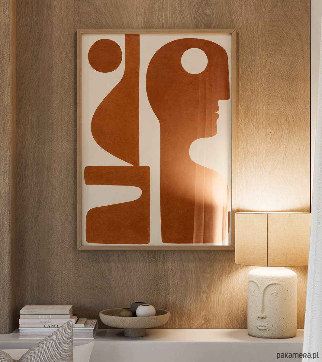 Wielka siła formy zawarta w prostych liniach. Ten plakat, zdominowany przez intensywny, ziemisty odcień terakoty, przedstawia wyrazistą, abstrakcyjną postać — profil ludzkiej głowy połączony z geometrycznym kształtem. Zamiast detali, całość skupia się na formie i symbolice, podkreślając minimalizm i duchową harmonię.