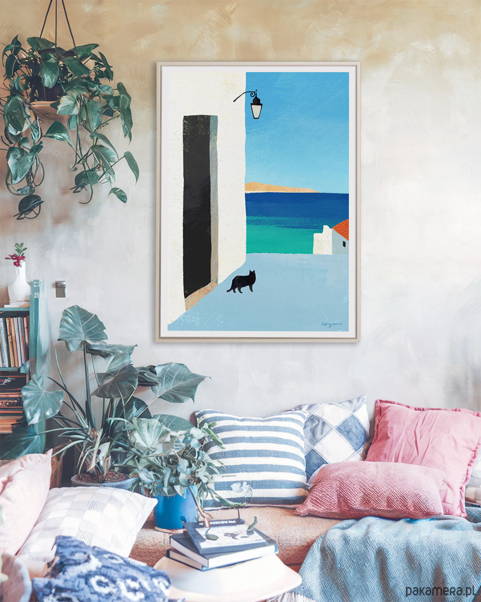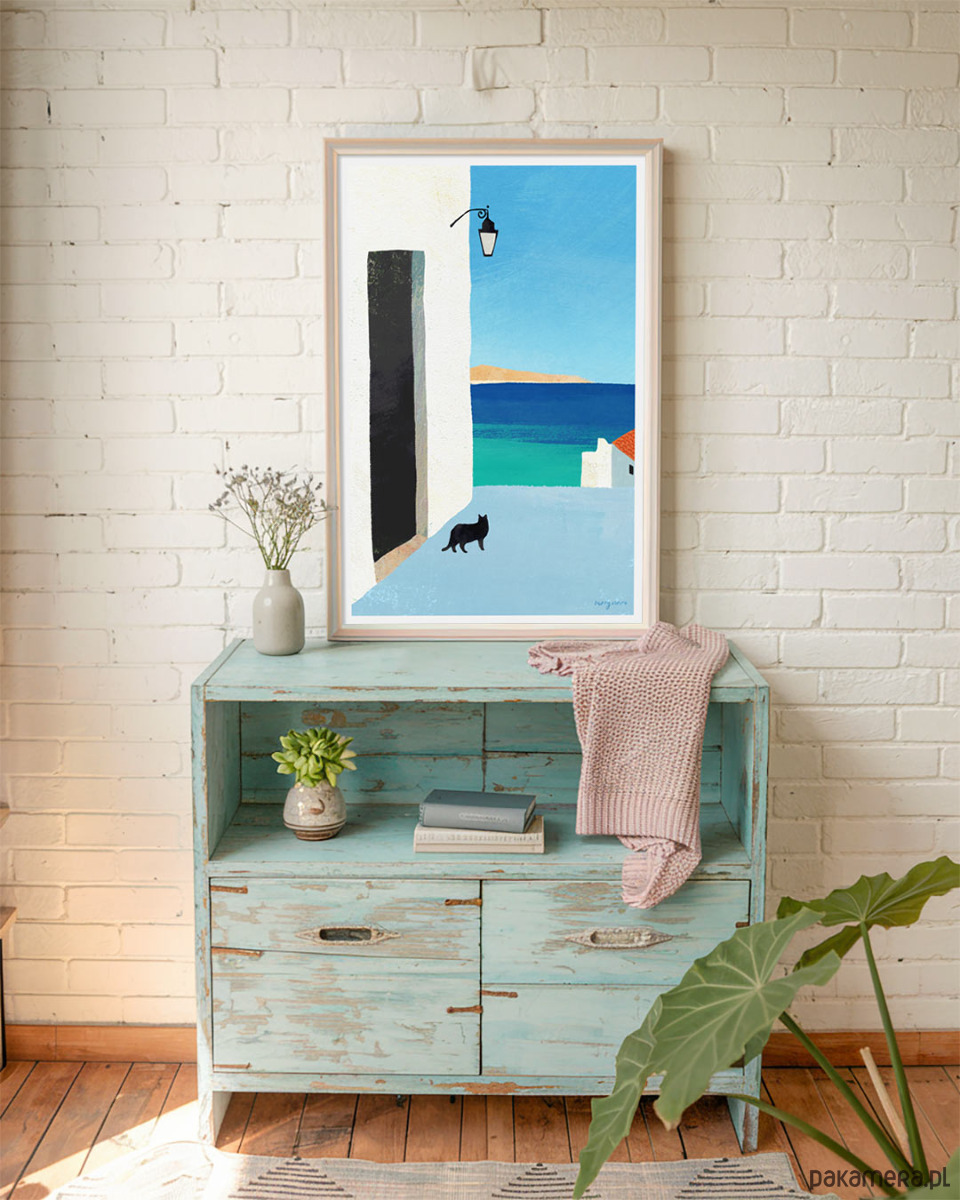 Ten wakacyjny plakat to dekoracja dla każdego, kto kocha letnie podróże. Nadmorskie miasteczko zagubione gdzieś na południu Europy, turkusowa tafla wody i czarny kot wybierający się na swoją kocią przechadzkę.