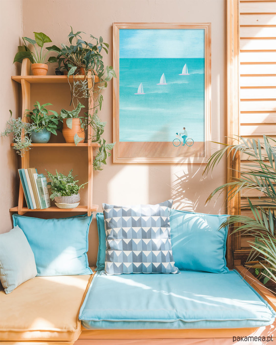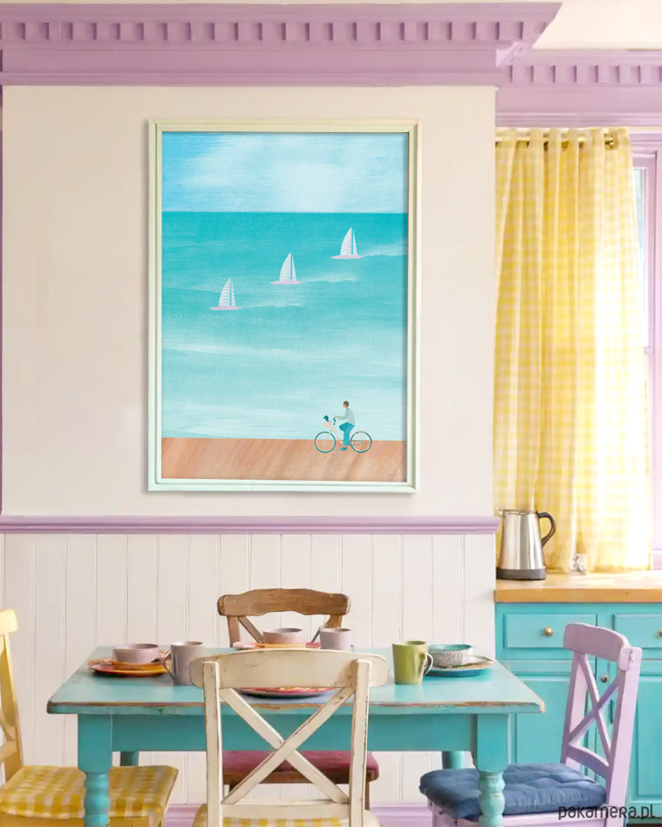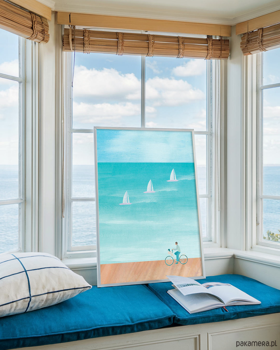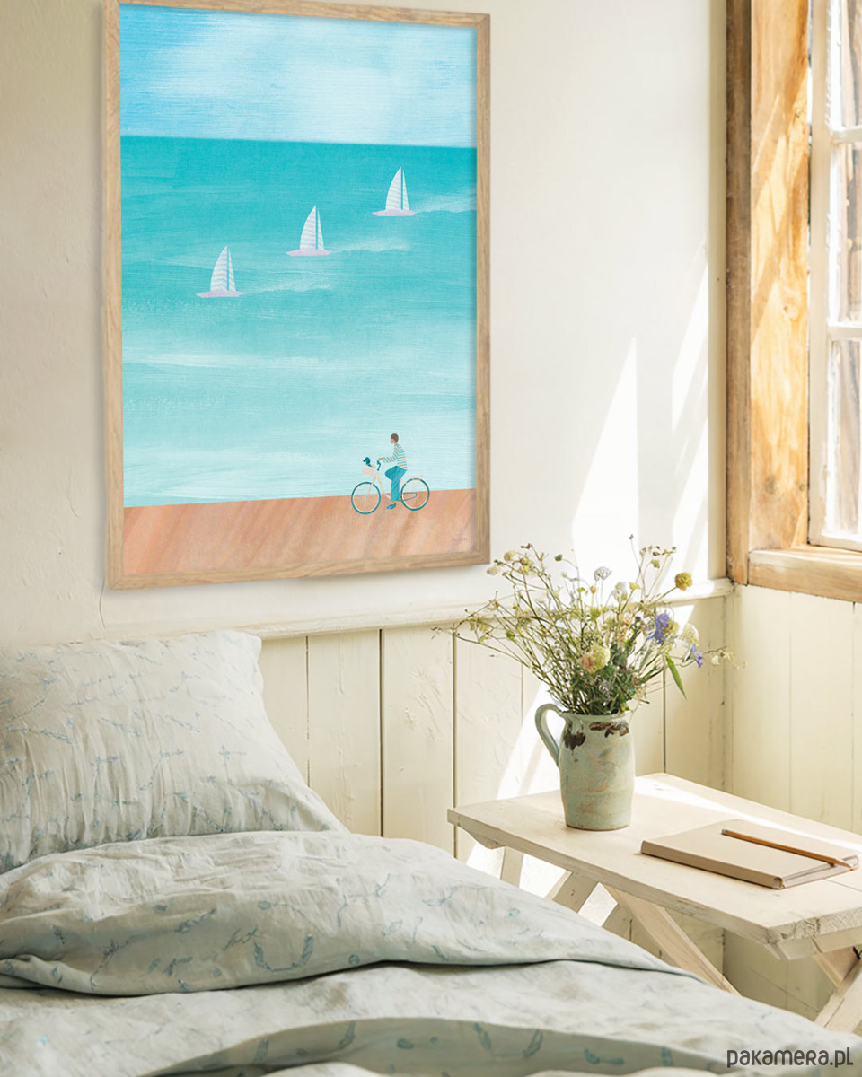 Plakat "Nad morzem - rower i żagle" chce uchwycić idealny dzień, po którym przynosi się do domu zapach wiatru i morskiej bryzy. To idealna dekoracja dla wszystkich fanek i fanów lata.