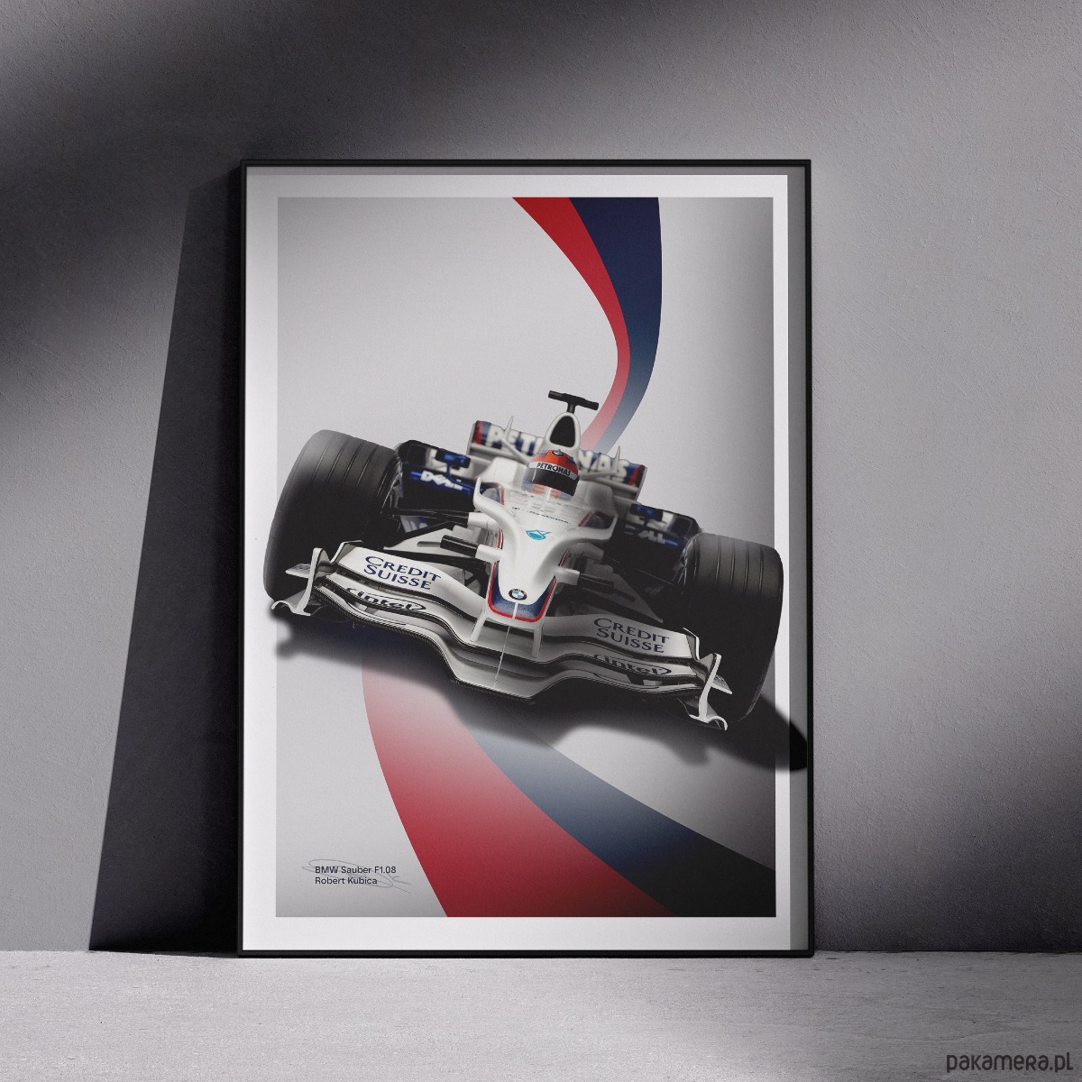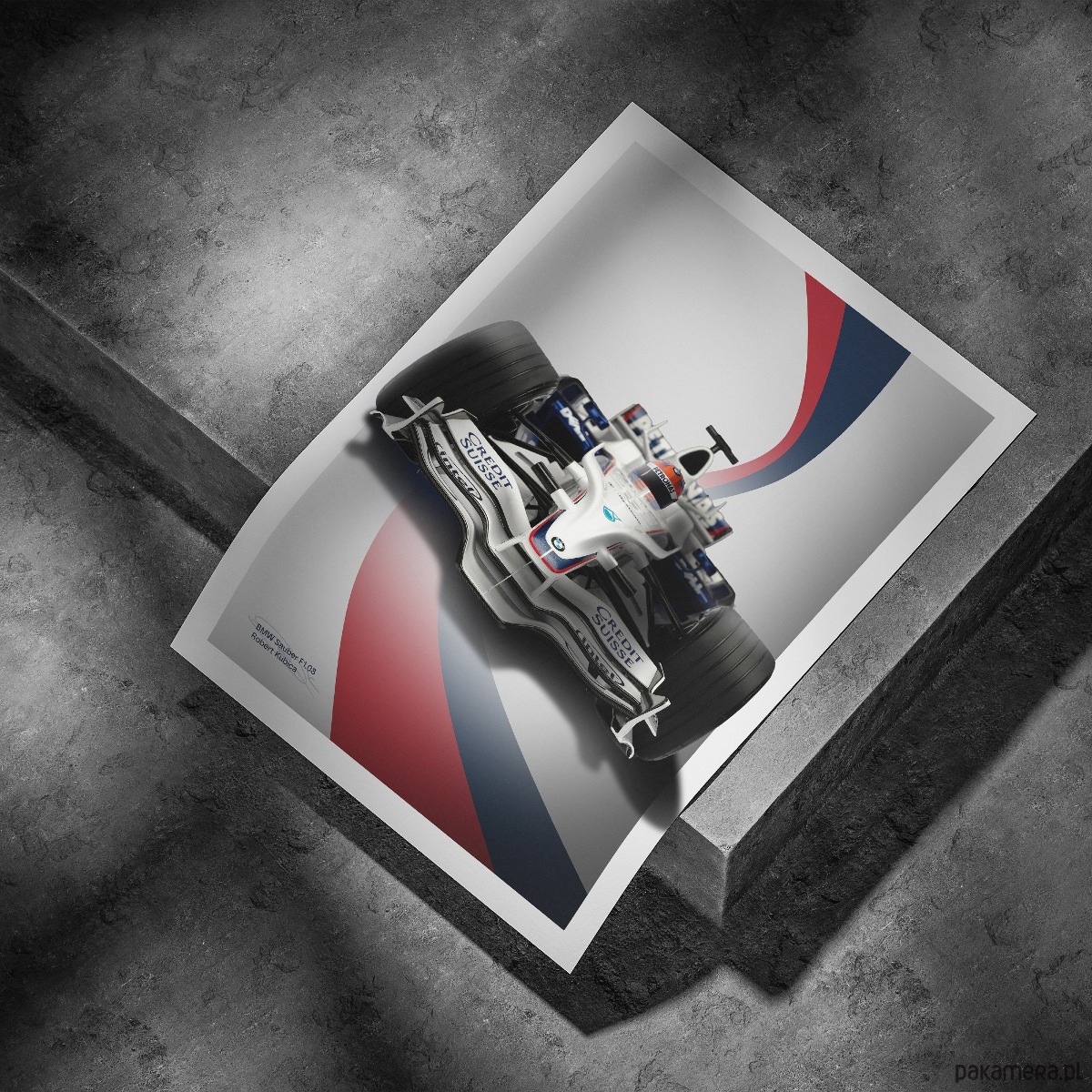 Plakat z modelem samochodu BMW Sauber F1-08 za kierownicą którego Robert Kubica wygrał wyścig F1 w GP Kanady