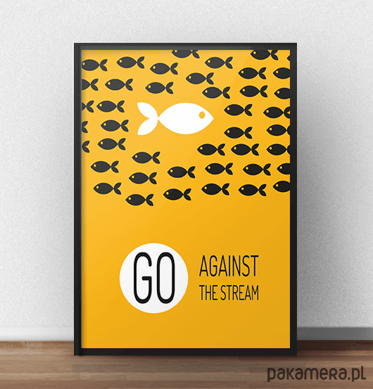 Plakat w rozmiarze 40x50 oprawiony w czarną aluminiową ramę. Żółty plakat z rybkami i jedną dużą białą rybką płynącą pod prąd. W dolnej części plakatu umieściliśmy napis "Go against the stream". Plakat wystawiony na indywidualne zamówienie klienta. Plakat w rozmiarze 40x50 oprawiony w czarną aluminiową ramę. Żółty plakat z rybkami i jedną dużą białą rybką płynącą pod prąd. W dolnej części plakatu umieściliśmy napis "Go against the stream".