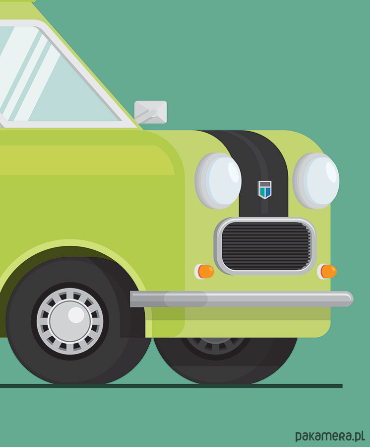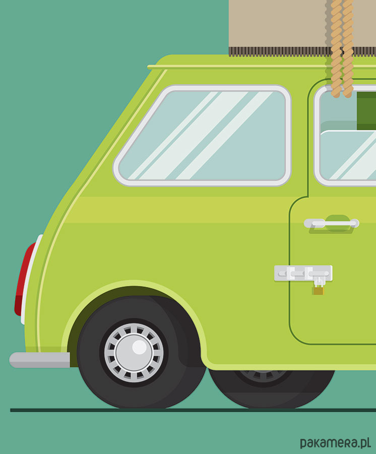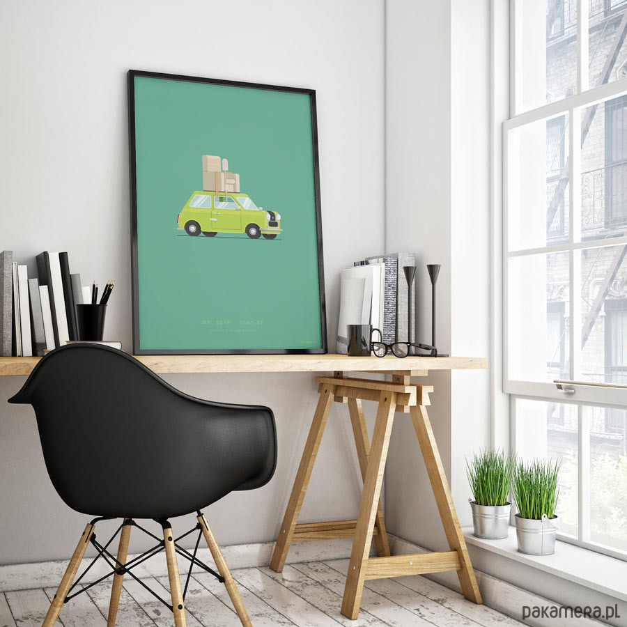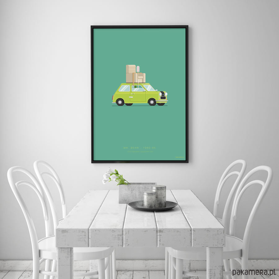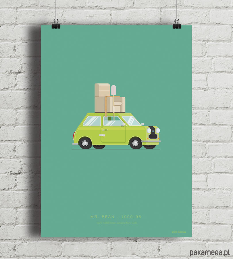 Plakat z autorską grafiką inspirowaną filmem "Jaś Fasola" (Mr. Bean). Pochodzi z serii "Famous Cars" i przedstawia samochód British Leyland Mini 1000 - model z lat 1976-1980.