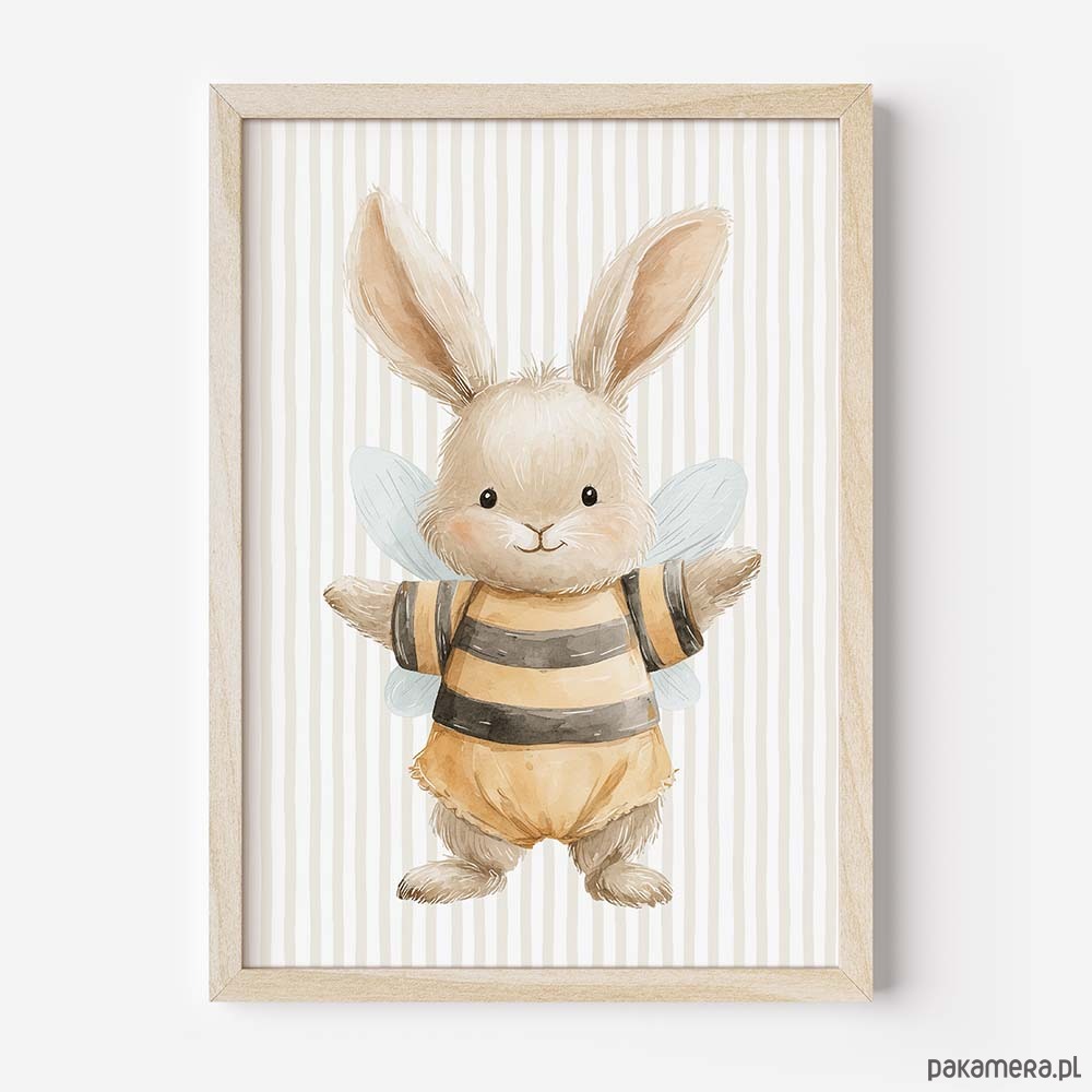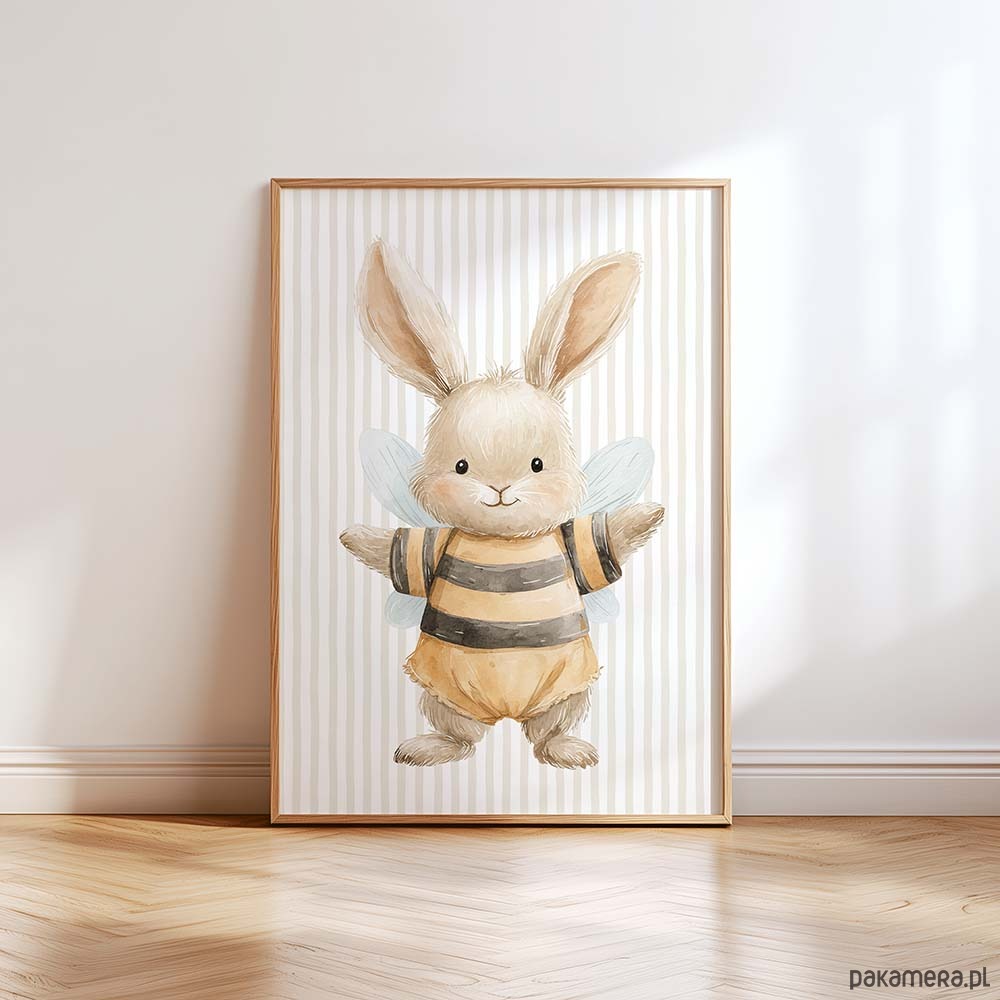 Urocza kolekcja plakatów dla dzieci ze zwierzątkami przebranymi za pszczółki to wyjątkowa dekoracja do pokoju niemowlaka, przedszkolaka i małego dziecka. Delikatne, bajkowe ilustracje łączą w sobie ciepły, dziecięcy styl z modnym motywem zwierzątek i pszczółek, tworząc przytulną atmosferę w pokoju dziecka. Plakaty świetnie pasują do wnętrz w stylu boho, skandynawskim, leśnym i pastelowym. To idealny wybór do dekoracji nad łóżeczko, komodę lub kącik zabaw. Kolekcja ze zwierzątkami w kostiumach pszczółek sprawdzi się jako ozdoba pokoju chłopca, dziewczynki oraz jako pomysł na prezent na baby shower, narodziny lub urodziny dziecka.