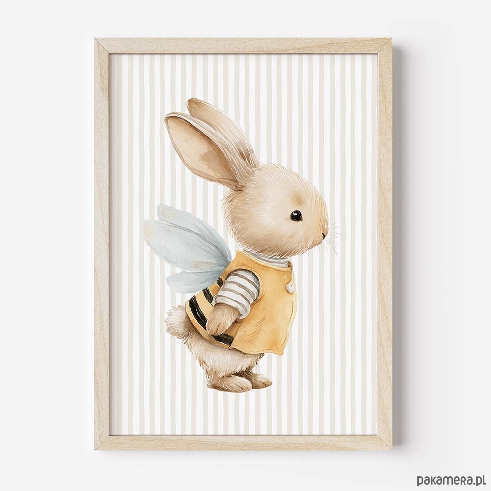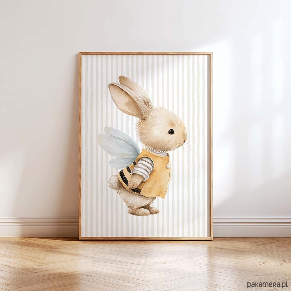 Urocza kolekcja plakatów dla dzieci ze zwierzątkami przebranymi za pszczółki to wyjątkowa dekoracja do pokoju niemowlaka, przedszkolaka i małego dziecka. Delikatne, bajkowe ilustracje łączą w sobie ciepły, dziecięcy styl z modnym motywem zwierzątek i pszczółek, tworząc przytulną atmosferę w pokoju dziecka. Plakaty świetnie pasują do wnętrz w stylu boho, skandynawskim, leśnym i pastelowym. To idealny wybór do dekoracji nad łóżeczko, komodę lub kącik zabaw. Kolekcja ze zwierzątkami w kostiumach pszczółek sprawdzi się jako ozdoba pokoju chłopca, dziewczynki oraz jako pomysł na prezent na baby shower, narodziny lub urodziny dziecka.