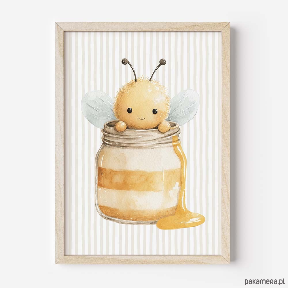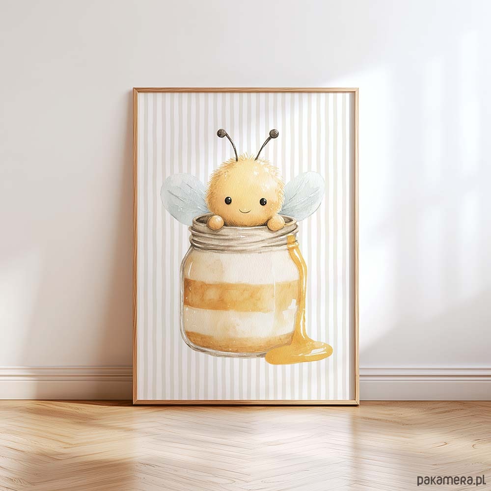 Urocza kolekcja plakatów dla dzieci ze zwierzątkami przebranymi za pszczółki to wyjątkowa dekoracja do pokoju niemowlaka, przedszkolaka i małego dziecka. Delikatne, bajkowe ilustracje łączą w sobie ciepły, dziecięcy styl z modnym motywem zwierzątek i pszczółek, tworząc przytulną atmosferę w pokoju dziecka. Plakaty świetnie pasują do wnętrz w stylu boho, skandynawskim, leśnym i pastelowym. To idealny wybór do dekoracji nad łóżeczko, komodę lub kącik zabaw. Kolekcja ze zwierzątkami w kostiumach pszczółek sprawdzi się jako ozdoba pokoju chłopca, dziewczynki oraz jako pomysł na prezent na baby shower, narodziny lub urodziny dziecka.