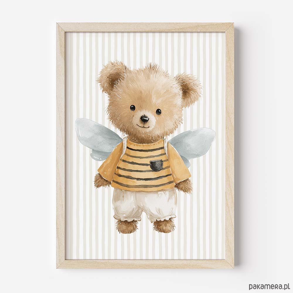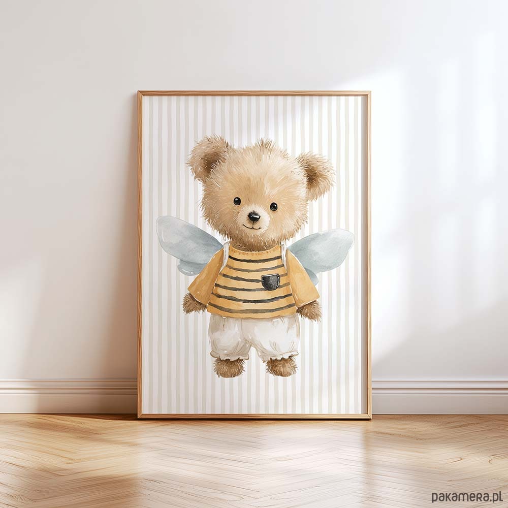 Urocza kolekcja plakatów dla dzieci ze zwierzątkami przebranymi za pszczółki to wyjątkowa dekoracja do pokoju niemowlaka, przedszkolaka i małego dziecka. Delikatne, bajkowe ilustracje łączą w sobie ciepły, dziecięcy styl z modnym motywem zwierzątek i pszczółek, tworząc przytulną atmosferę w pokoju dziecka. Plakaty świetnie pasują do wnętrz w stylu boho, skandynawskim, leśnym i pastelowym. To idealny wybór do dekoracji nad łóżeczko, komodę lub kącik zabaw. Kolekcja ze zwierzątkami w kostiumach pszczółek sprawdzi się jako ozdoba pokoju chłopca, dziewczynki oraz jako pomysł na prezent na baby shower, narodziny lub urodziny dziecka.