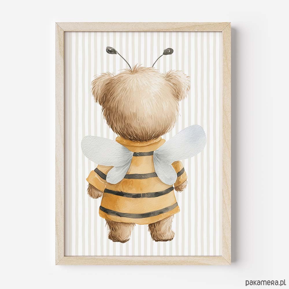 Urocza kolekcja plakatów dla dzieci ze zwierzątkami przebranymi za pszczółki to wyjątkowa dekoracja do pokoju niemowlaka, przedszkolaka i małego dziecka. Delikatne, bajkowe ilustracje łączą w sobie ciepły, dziecięcy styl z modnym motywem zwierzątek i pszczółek, tworząc przytulną atmosferę w pokoju dziecka. Plakaty świetnie pasują do wnętrz w stylu boho, skandynawskim, leśnym i pastelowym. To idealny wybór do dekoracji nad łóżeczko, komodę lub kącik zabaw. Kolekcja ze zwierzątkami w kostiumach pszczółek sprawdzi się jako ozdoba pokoju chłopca, dziewczynki oraz jako pomysł na prezent na baby shower, narodziny lub urodziny dziecka.