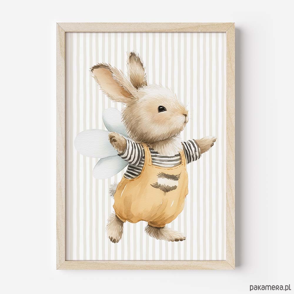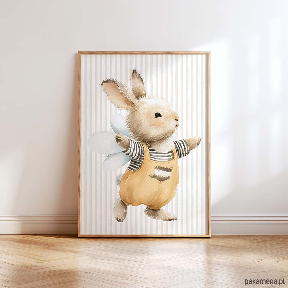 Urocza kolekcja plakatów dla dzieci ze zwierzątkami przebranymi za pszczółki to wyjątkowa dekoracja do pokoju niemowlaka, przedszkolaka i małego dziecka. Delikatne, bajkowe ilustracje łączą w sobie ciepły, dziecięcy styl z modnym motywem zwierzątek i pszczółek, tworząc przytulną atmosferę w pokoju dziecka. Plakaty świetnie pasują do wnętrz w stylu boho, skandynawskim, leśnym i pastelowym. To idealny wybór do dekoracji nad łóżeczko, komodę lub kącik zabaw. Kolekcja ze zwierzątkami w kostiumach pszczółek sprawdzi się jako ozdoba pokoju chłopca, dziewczynki oraz jako pomysł na prezent na baby shower, narodziny lub urodziny dziecka.