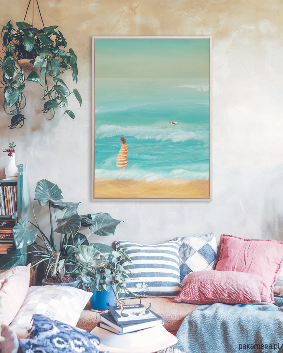 Plakat Wakacje z psem w ciepłych błękitach oswaja krajobraz morski zmieniając go we wspomnienie idealnego, letniego dnia. Plakat wakacyjny doskonale wpisuje się w filozofię slow life i zachęca, by cieszyć się każdą chwilą.