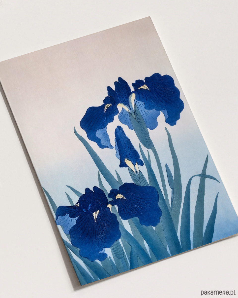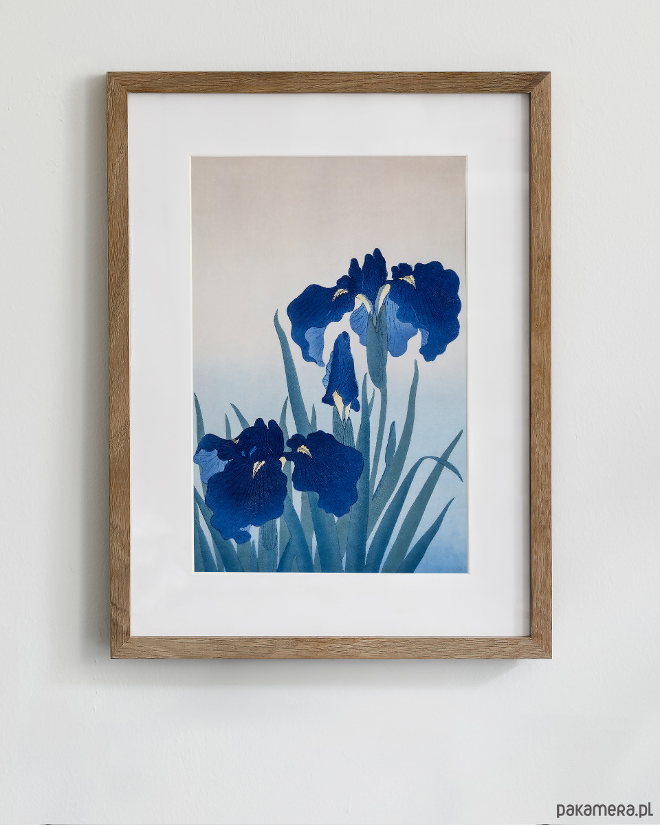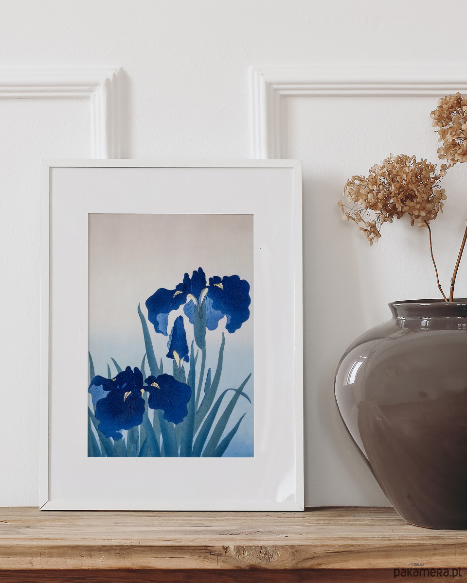 Plakat z serii JAPANDI przedstawiający niebieskie irysy na blado różowo-niebieskim tle.