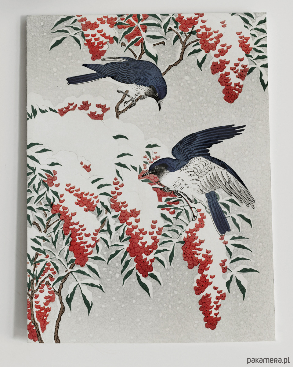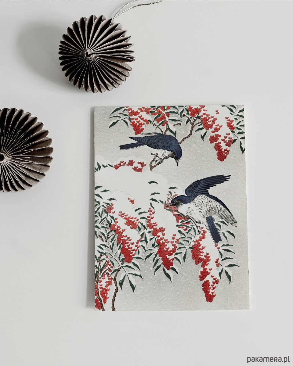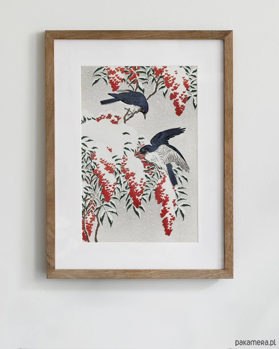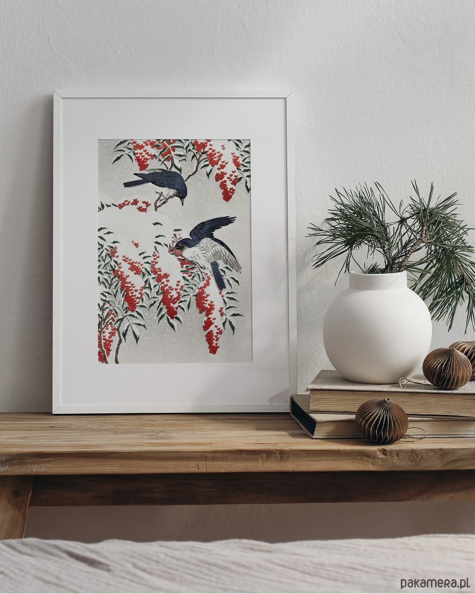 Plakat przedstawiający niebieskie muchołówki w zimowej scenerii wśród gałęzi z czerwonymi owocami. W tle padający śnieg. Ilustracja wykonana metodą drzeworytu.