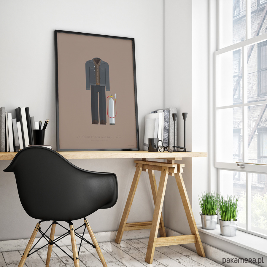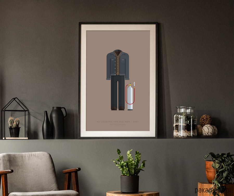 Plakat z autorską grafiką inspirowaną filmem "To Nie Jest Kraj Dla Stary Ludzi" (No Country For Old Men), reż. Etahn Coen i Joel Coen. Pochodzi z serii "Cinema Costumes" (Kostiumy kinowe) i przedstawia strój Antona Chigurha.