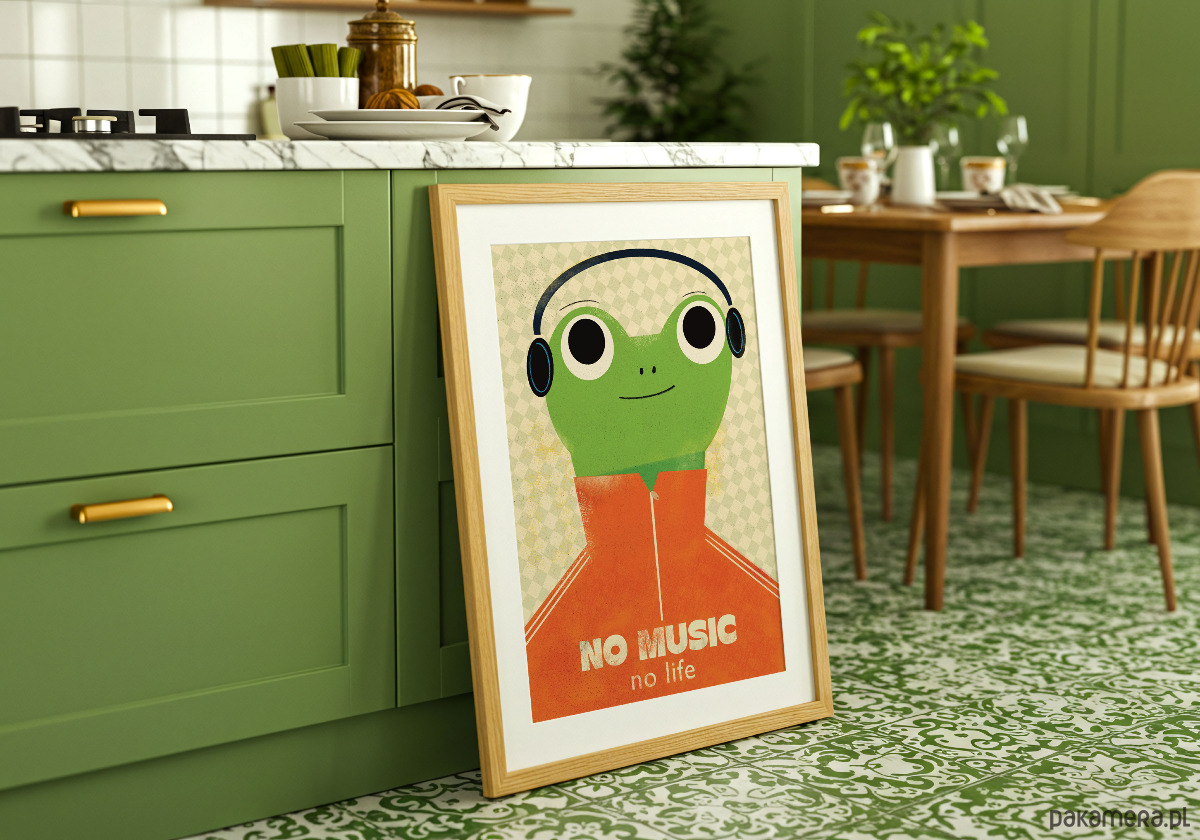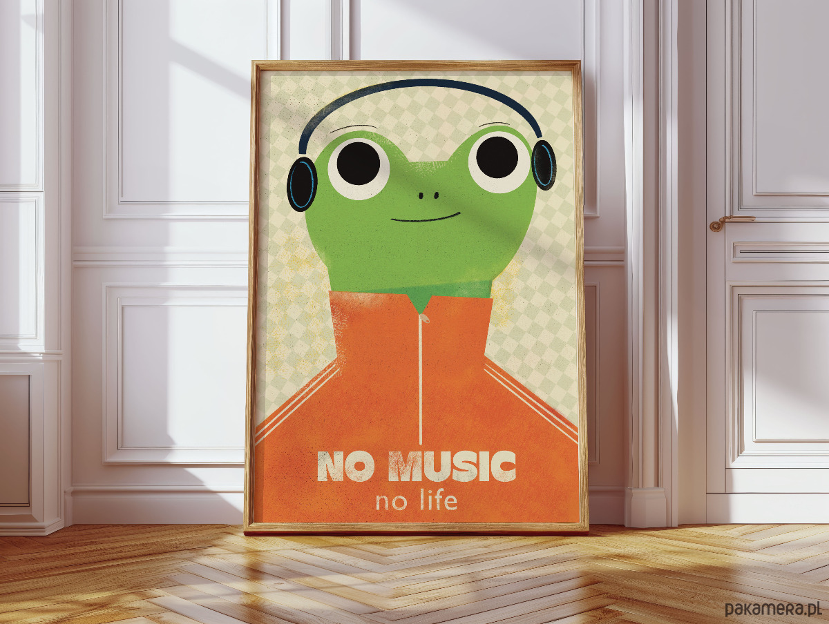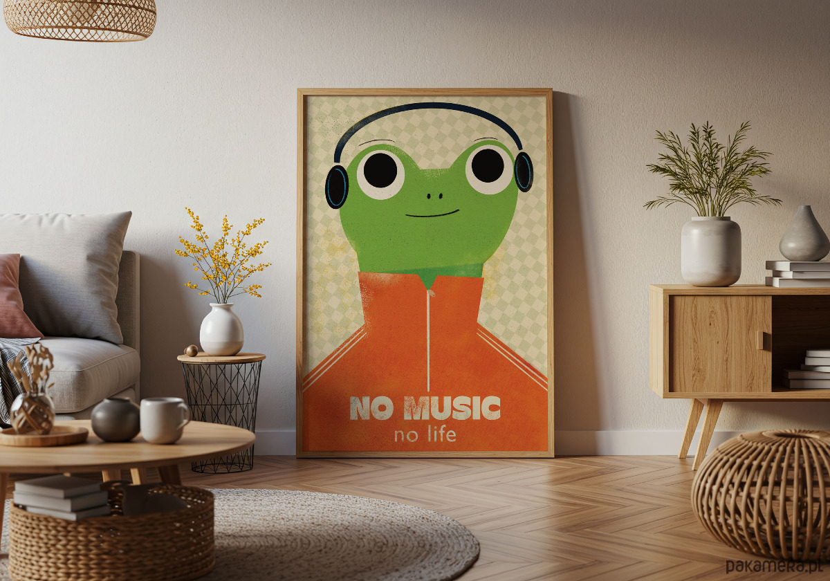 Wprowadź do wnętrza odrobinę humoru i stylu z plakatem „NO MUSIC no life”. Przedstawia zieloną żabę w czarnych słuchawkach i pomarańczowym dresie – postać pełną luzu i muzycznej pasji. Ilustracja utrzymana jest w lekkim, graficznym stylu z subtelnym tłem. Fajnie sprawdzi się w pokoju nastolatka oraz fana muzyki.