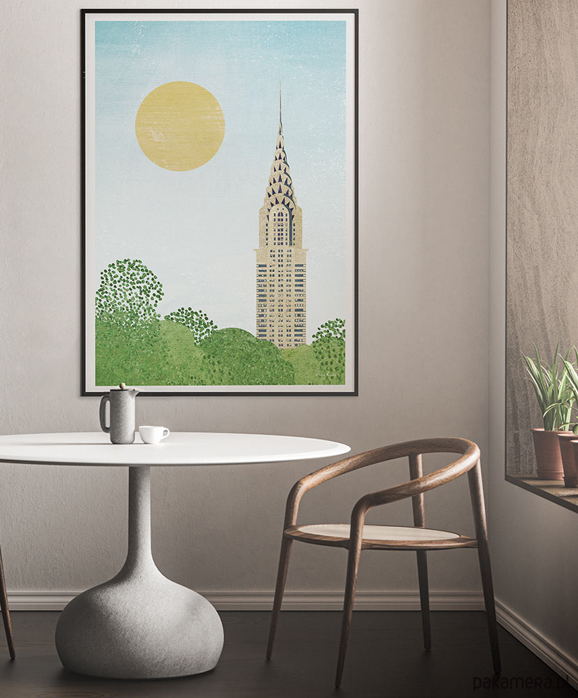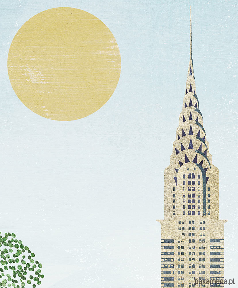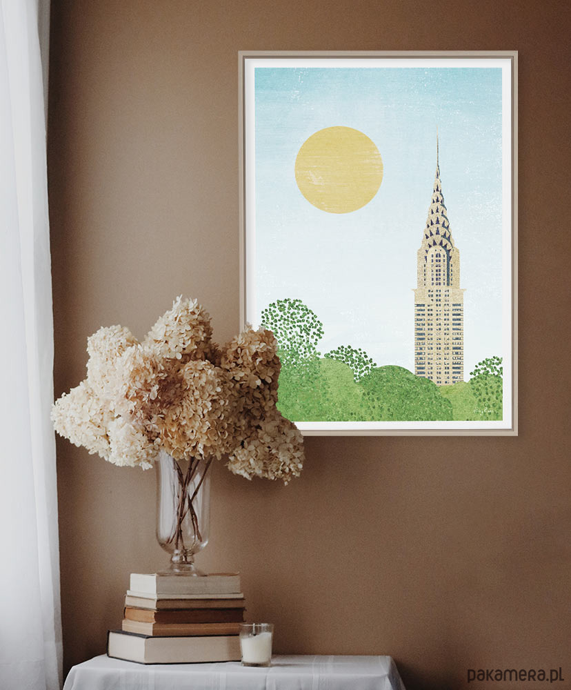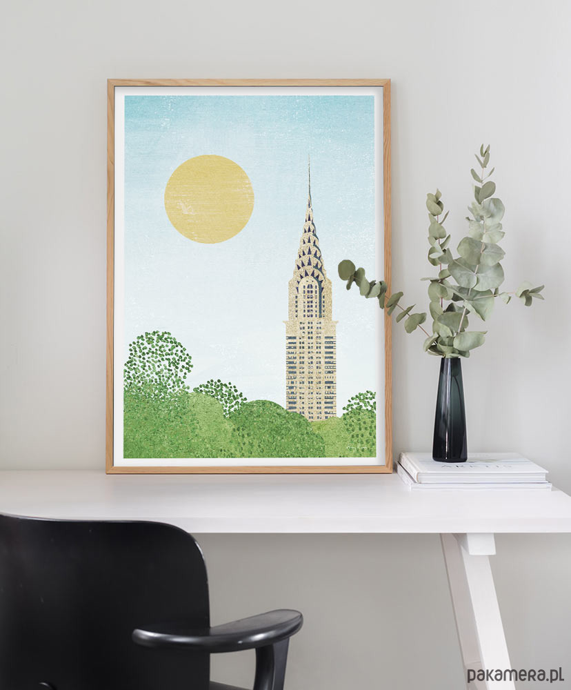 Plakat z Chrysler Building - symbolem Nowego Jorku i pięknie zdobioną ikoną stylu art deco. Na naszym plakacie wybija się ponad drzewa celując w błękitne niebo. To wysmakowana dekoracja nie tylko dla zapalonych podróżników, ale też dla fanów architektonicznych perełek i wszystkich miłośników Nowego Jorku.