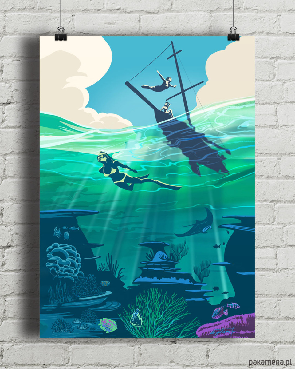 Plakat "Nurkowanie / Podwodne światy" to kwintesencja lata. Turkusowa, przejrzysta woda i błękitne niebo to zachęta, by spędzić dzień na eksplorowaniu podwodnych krain. Plakat nurkowy dla każdego, kto kocha długie, letnie dni i morskie wyzwania.